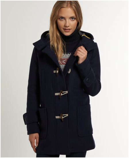 Duffle is a thick and somewhat coarse woolen material. These coats are extremely warm but can get itchy. Therefore a scarf around your neck is a good addition with this type of coats. They usually have a hood attached with them and come with wooden buttons and leather or rope loops. These coats have a hardy look and are good choice for extremely cold days when you have to go out and be the super woman that you are.