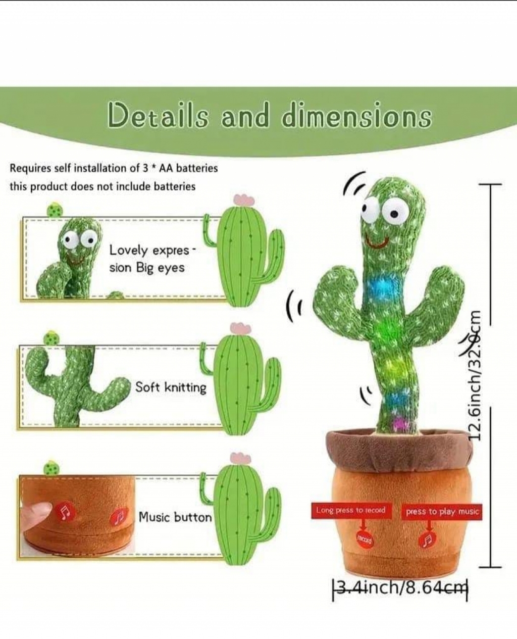 Material: Plush • Product Type: Dancing Cactus Plush Toy For Kids • Details: Soft, Distracts The Kids And Make Sounds, Kids Friendly, Safe To Use, Suitable For 1 Year And Above Kids,Contains 120 Different Songs, • Package Includes: 1 x Dancing Cactus Plush Toy