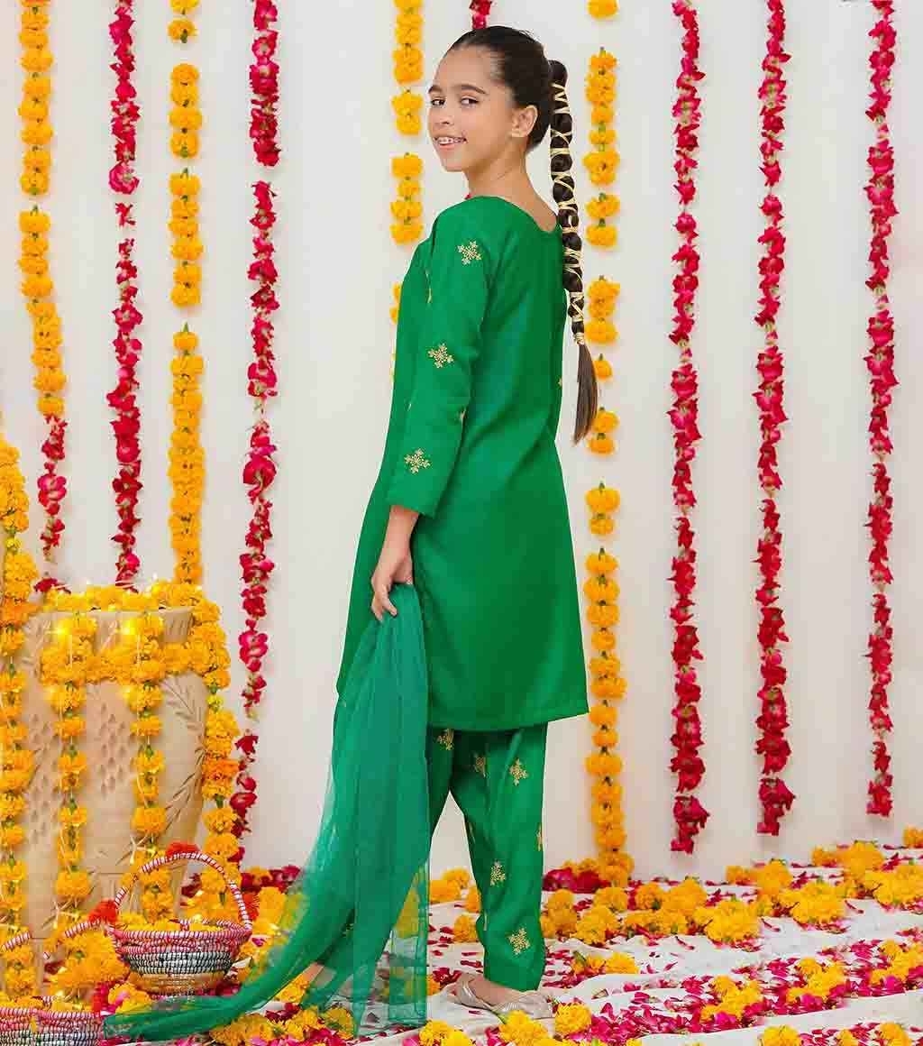 Transform any day into a celebration with our spellbinding kids ethnic wear – a fusion of tradition and trend. Shirt Fabric: Raw Silk. Trouser Fabric: Raw Silk. Dupatta Fabric: Net. Detailing: Discover the artistry in every stitch with finely embroidered patterns gracing both the neckline and shalwar