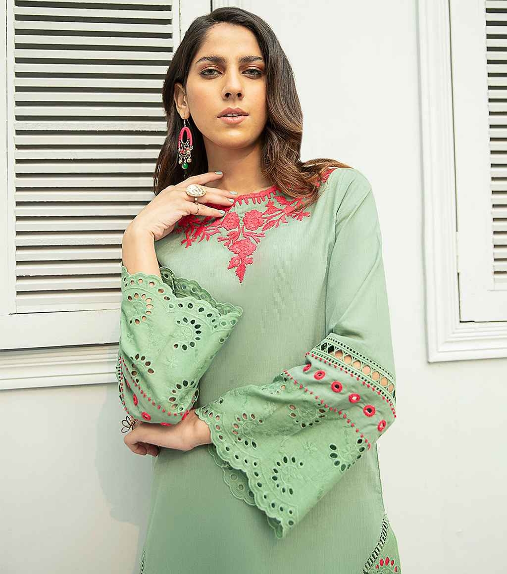 2 Piece Stitched Lawn Shirt Cambric Cotton Trouser Popping pink neckline embroidery Delicate mirror work on sleeves Actual Color may slightly vary from picture Model Wearing Small Size Only Shirt length will be according to the design pattern, not according to size chart