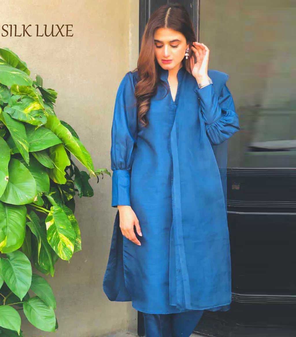 Ready To Wear Zink 3pc Suit Silk For Women By Teen Meter Collection Name: 3pc Silk Luxe Collection 3PC Shirt Trouser & Dupatta. Fabric: Silk and Organza Color : Zinc Description: Collar Neck shirt with Puff Sleeves and cuff ,loops on front , round hem with straight pants and organza Dupatta. Size Extra Small, Small, Medium, Large, Extra Large