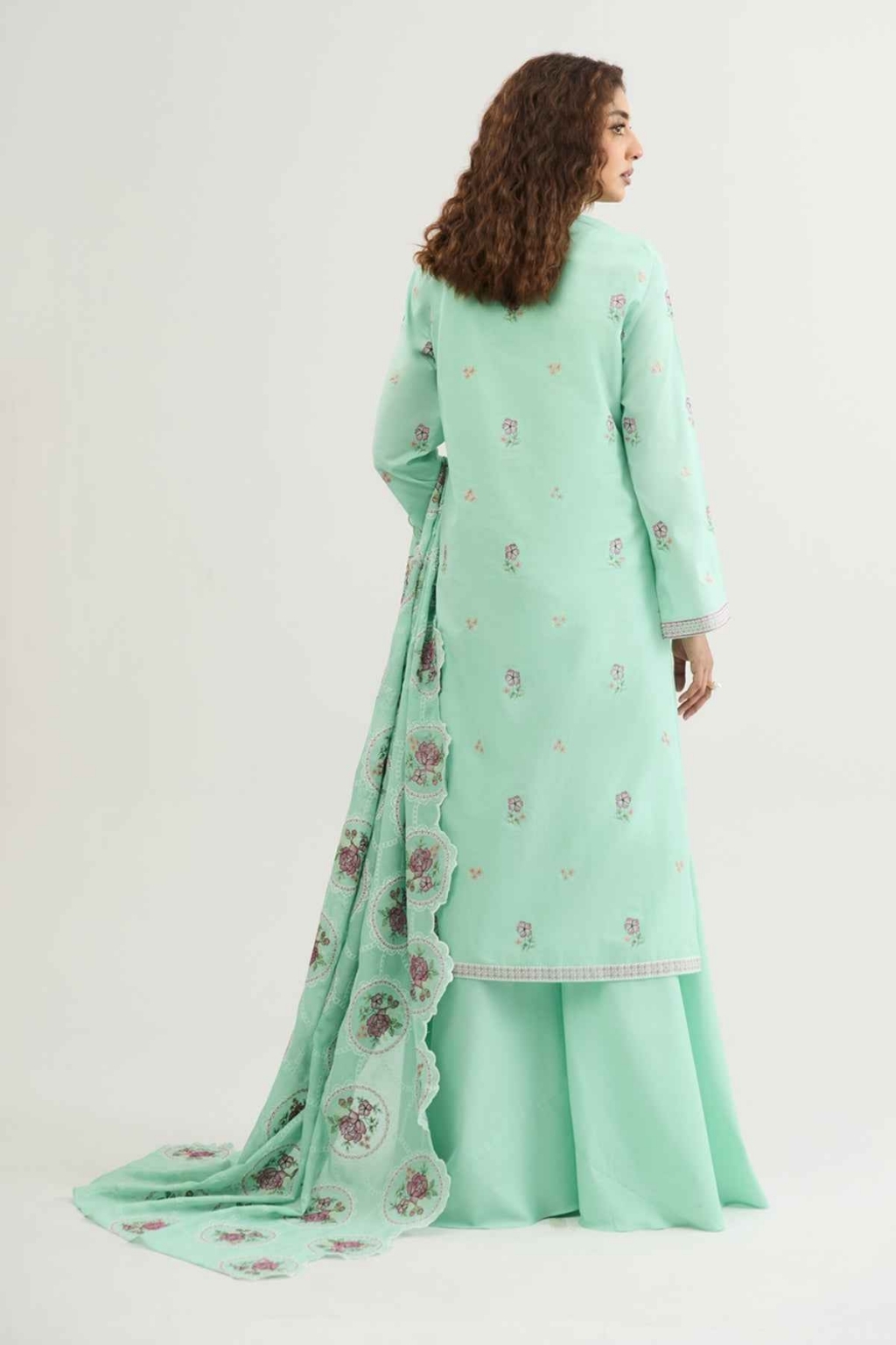 Eid collection 2026 sale 3-Piece Unstitched Shirt Dyed & Embroidered Wider Width Lawn Shirt Front 1 M Dyed & Embroidered Wider Width Lawn Shirt Back 1 M Dyed & Embroidered Wider Width Lawn Sleeves 0.66 M Fabric: Lawn Color: Aqua Dupatta Dyed & Embroidered Dhaka Malmal Dupatta 2.5 M Fabric: Dhaka Malmal Color: Aqua Trouser Dyed Cambric Trouser 2.5 M Fabric: Cambric Color: Aqua