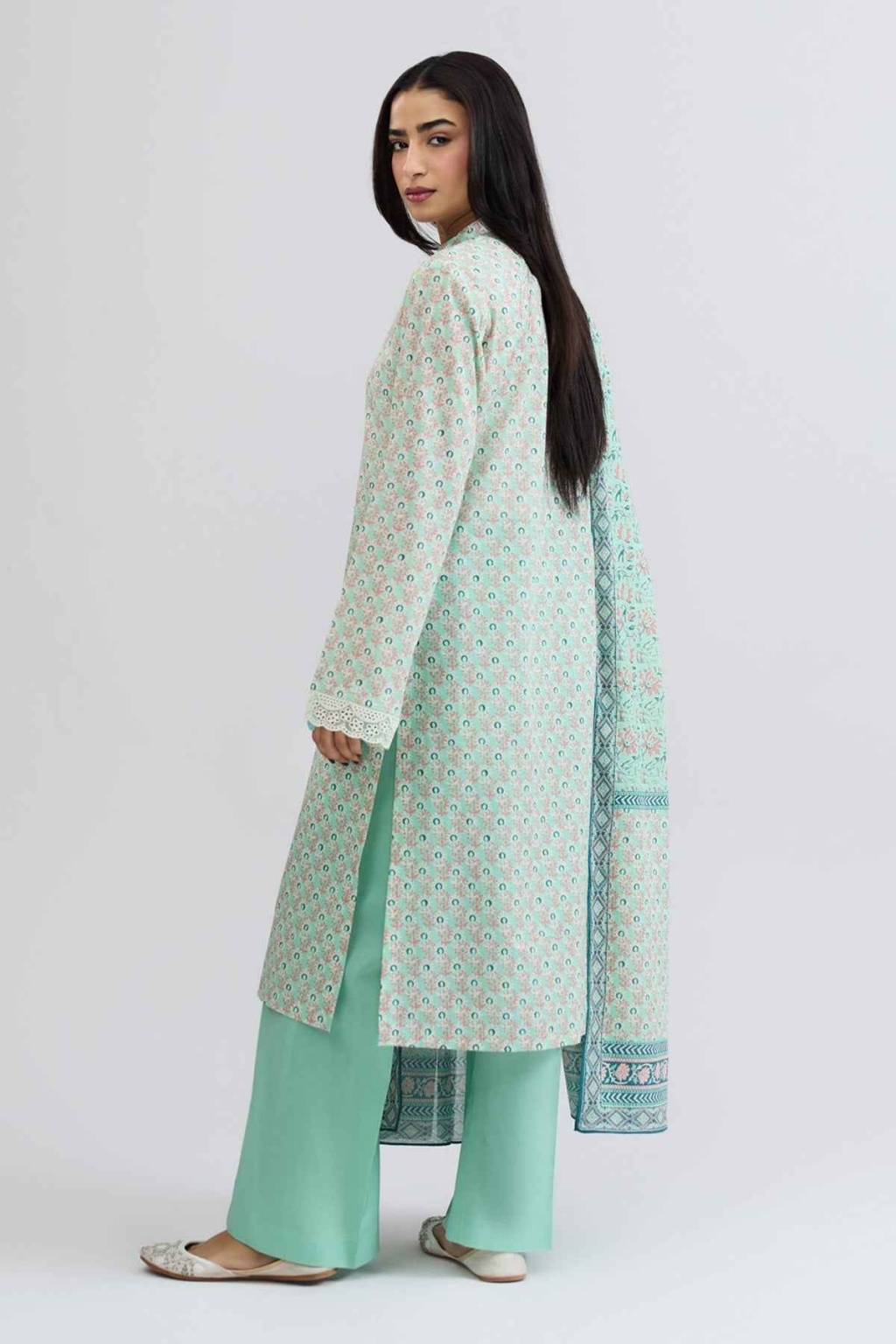 Eid collection 2026 sale 3-Piece Unstitched Shirt Printed Wider Width Lawn Shirt 1.8 M Dyed & Embroidered Organza Lace 2 M Fabric: Lawn Color: Aqua Dupatta Printed Lawn Dupatta 2.5 M Fabric: Lawn Color: Aqua Trouser Printed Cambric Trouser 1.7 M Fabric: Cambric Color: Aqua
