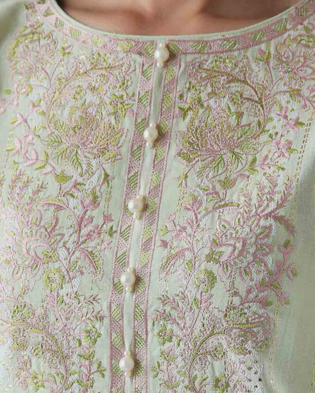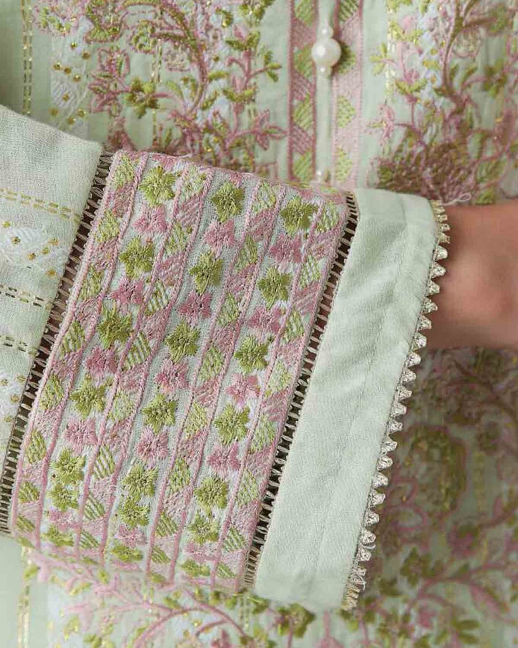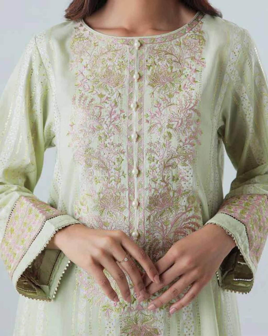 Beechtree sale on Eledant Glam Green-Embroidered-2P 1.14 Mtrs Golden Lurex Jacquard Front With Embroidery 0.5 Mtrs Silver Lurex Jacquard Sleeves 0.7 Mtrs Embroidered Sleeve Border 1.14 Mtrs Silver Lurex Jacquard Back 2.5 Mtrs Dyed Pants Beechtree Summer Sale Collection 2022