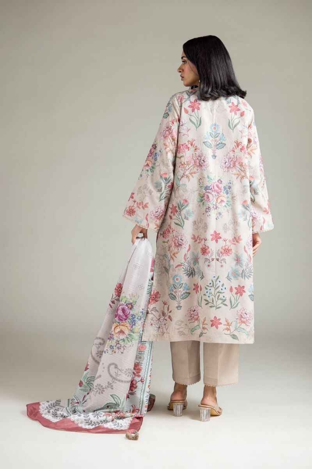 Fabrics 3 Piece Top Fabric: Digital Printed | Jacquard | 3m Bottom Fabric: Dyed | Cotton Viscose | 2.5m Dupatta Fabric: Digital Printed | Polyester Silk | 2.5m Material: Jacquard Add Ons: Embroidered Organza Neckline Embroidered Organza Bunches | 2pc