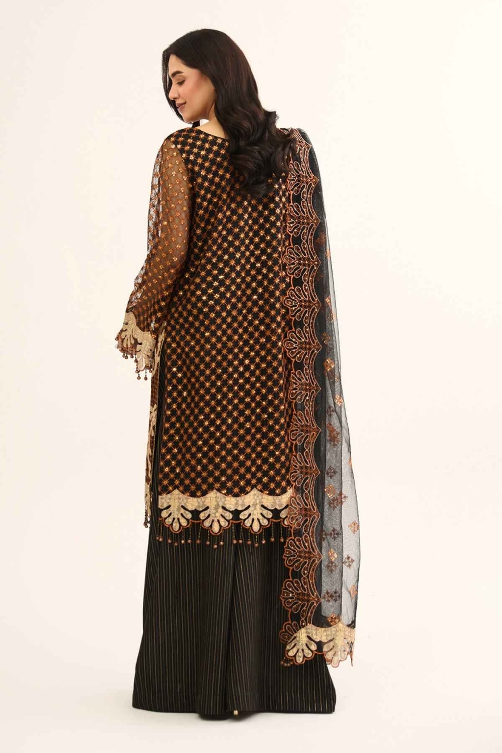 Eid collection 2026 sale 4-Piece Unstitched Shirt Dyed & Applique Embroidered Hexa Poly Net Shirt Front 1 M Dyed & Embroidered Hexa Poly Net Shirt Back & Sleeves 1.5 M Dyed & Applique Embroidered Hexa Poly Net Lace For Shirt Back & Sleeves 1.8 M Fabric: Poly Net Color: Black Lining Dyed Cotton Silk Lining 2.5 M Fabric: Cotton Silk Color: Black Dupatta Dyed & Embroidered Hexa Poly Net Dupatta 2.5 M Dyed & Applique Embroidered Hexa Poly Net Lace For Dupatta Pallu 2.5 M Fabric: Poly Net Color: Black Trouser Dyed Wider Width Golden Jacquard Trouser 2.5 M Fabric: Golden Jacquard Color: Black