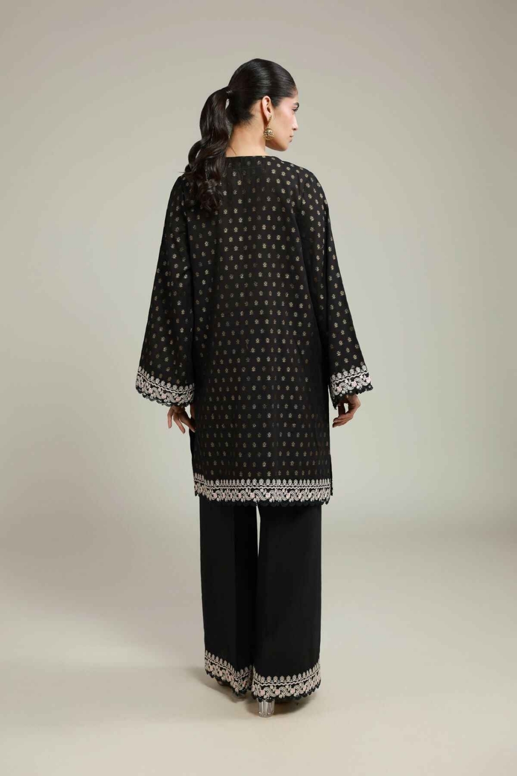 Fabrics 2 Piece | Top and Bottom Top Fabric: Dyed | Jacquard | 3.25m Bottom Fabric: Dyed | Cambric | 2.5m Material: Jacquard Add Ons: Embroidered Organza Bunches | 2pc Embroidered Organza Border | 3m Embroidered Organza Border | 1m Embroidered Organza Border | 1.66m
