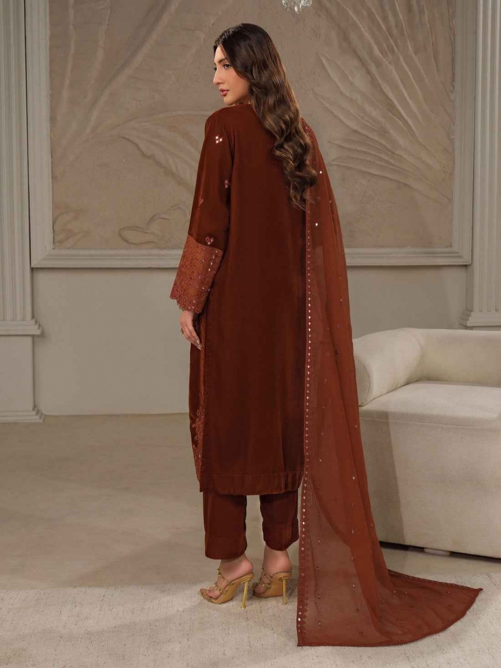Shirt Dyed embroidered shirt Fabric: Velvet Dupatta Dyed embroidered dupatta Fabric: Khaadi Net Trouser Dyed trouser Fabric: Velvet Color: Rust