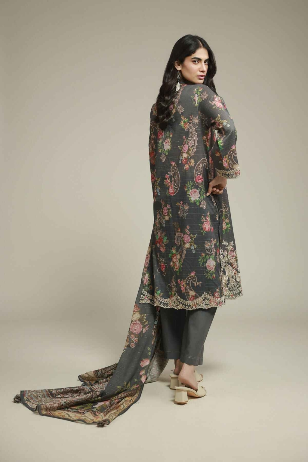 Style Collection: Charcoal Grey with Multi Color Embroidery unstitched 3 piece Embroidered Mesuri suit by khaadi