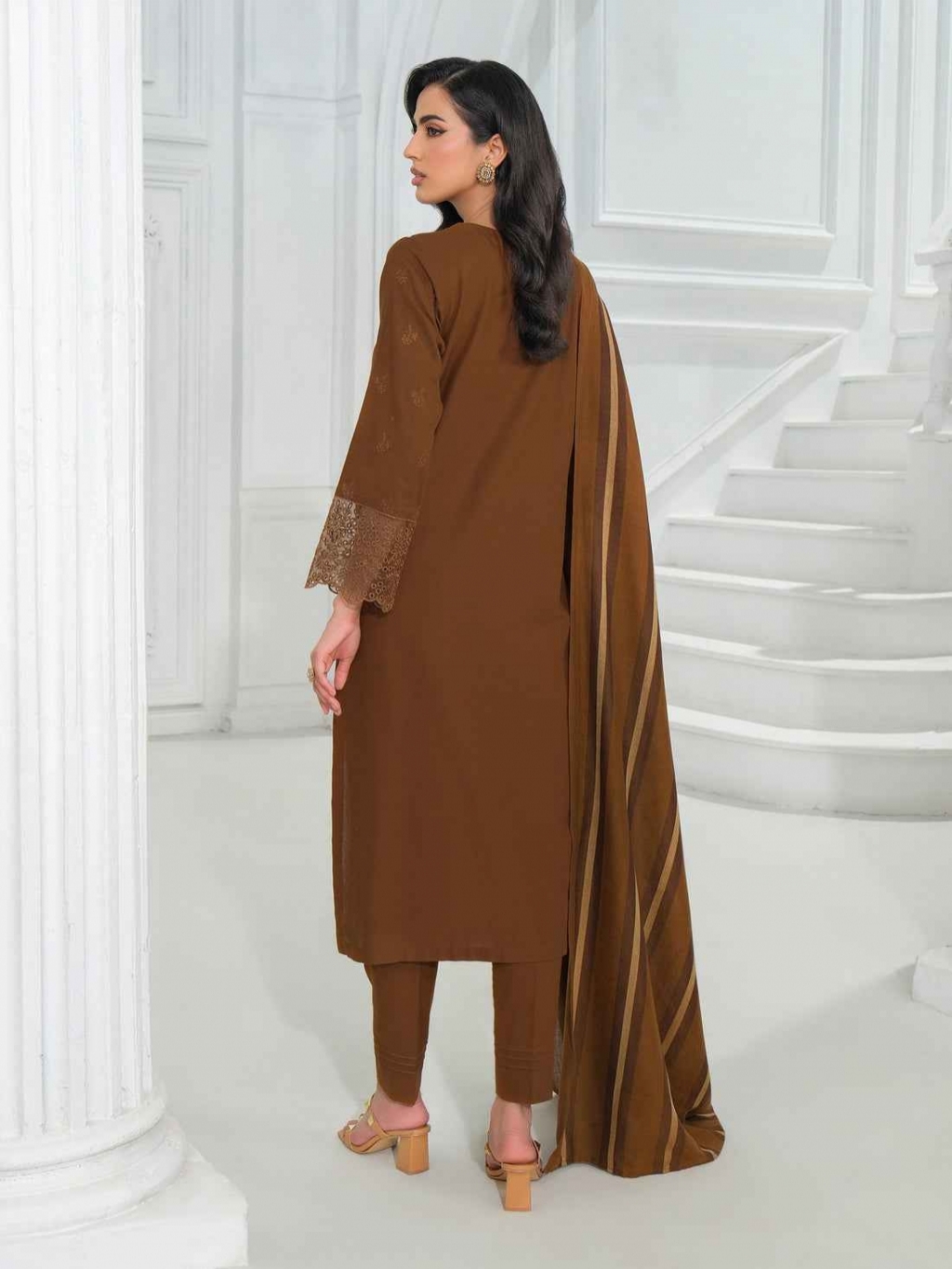 Shirt Dyed embroidered shirt Fabric: Khaddar Dupatta Printed dupatta Fabric: Yarn Dyed Trouser Dyed trouser Fabric: Khaddar Color: Brown