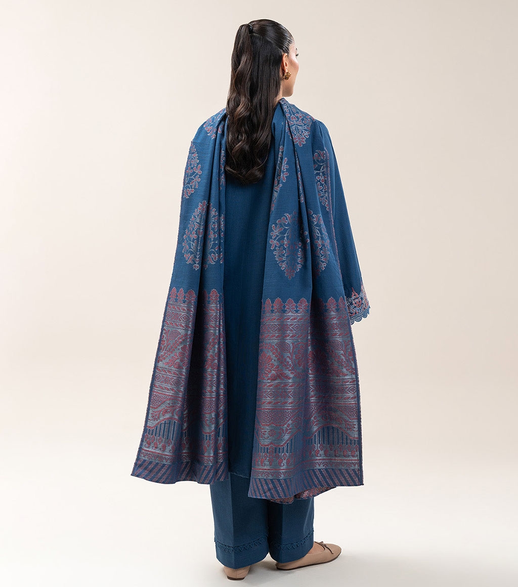 1.2 Mtrs Embroidered Light-Khaddar Front, 0.76 Mtrs Embroidered Front Border, 0.5 Mtrs Embroidered Light-Khaddar Sleeves, 1.2 Mtrs Light-Khaddar Back, 2.5 Mtrs Jacquarad Shawl, 1.8 Mtrs Dyed Pants
