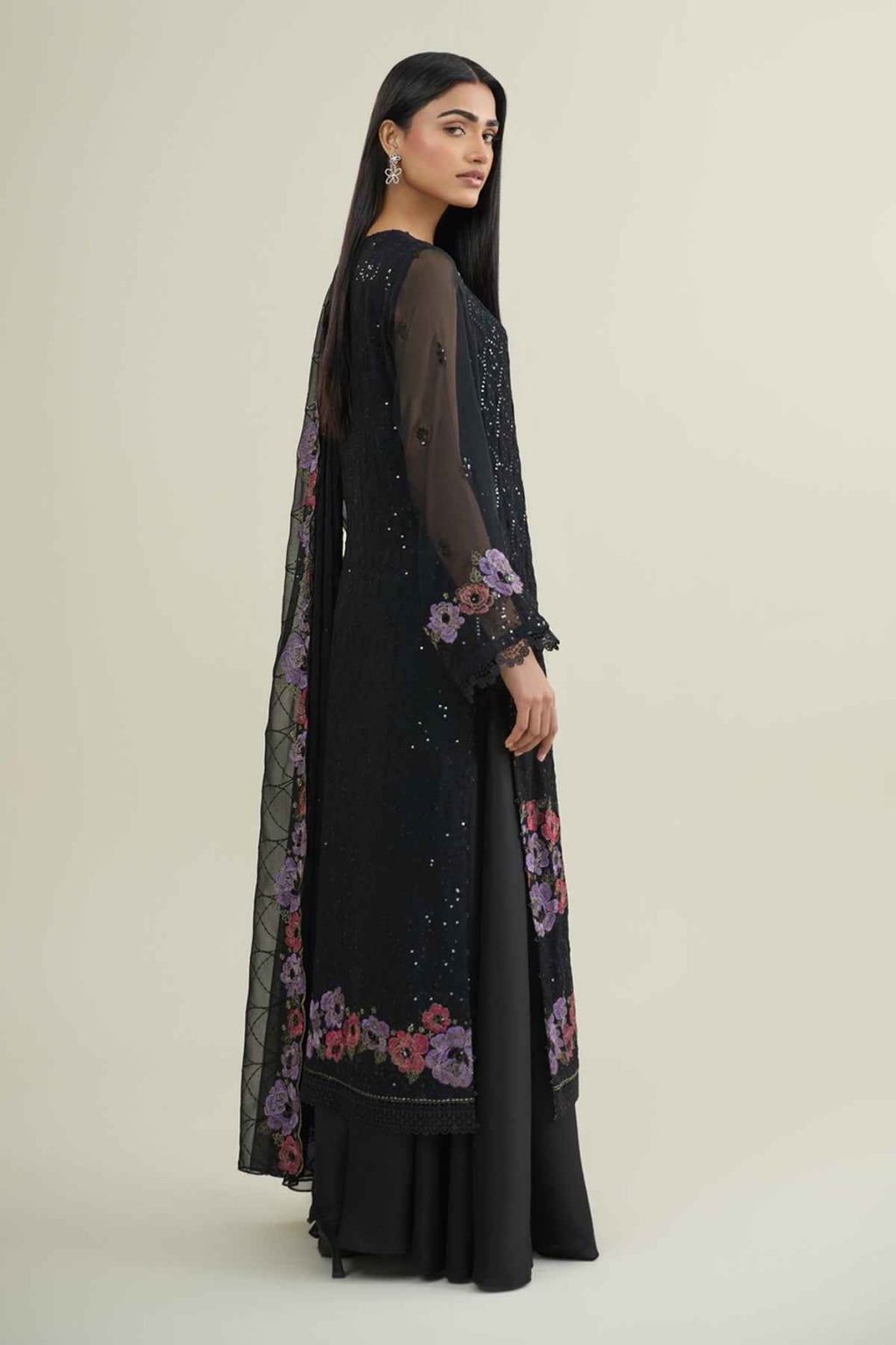 Eid collection 2026 sale 4-Piece Unstitched Shirt Dyed & Embroidered Bamber Chiffon Shirt Front 1.25 M Dyed & Embroidered Bamber Chiffon Shirt Back 1.25 M Dyed & Embroidered Bamber Chiffon Sleeves 0.66 M Fabric: Bamber Chiffon Color: Black Lining Dyed Cotton Silk Lining 2.5M Fabric: Cotton Silk Color: Black Dupatta Dyed & Embroidered Bamber Chiffon Dupatta 2.5 M Fabric: Bamber Chiffon Color: Black Trouser Dyed Wider Width Raw Silk Trouser 2.5 M Fabric: Raw Silk Color: Black