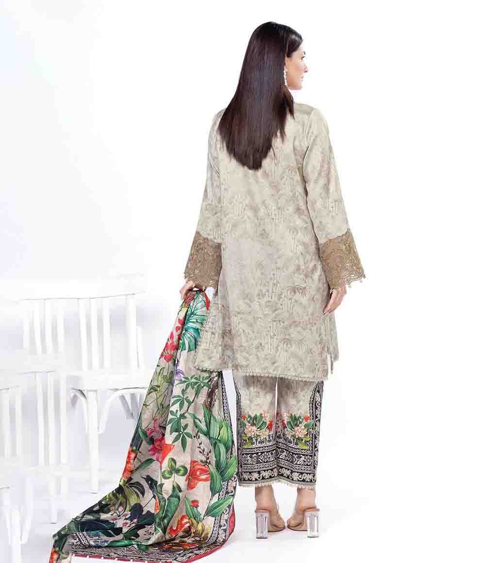 Top Fabric: Digital Printed Cotton Satin | 3m Bottom Fabric: Digital Printed Cotton Satin | 2.5m Dupatta Fabric: Digital Printed Polyester Silk | 2.5m Add Ons: Embroidered Organza Neckline Embroidered Organza Sleeves Border | 1m