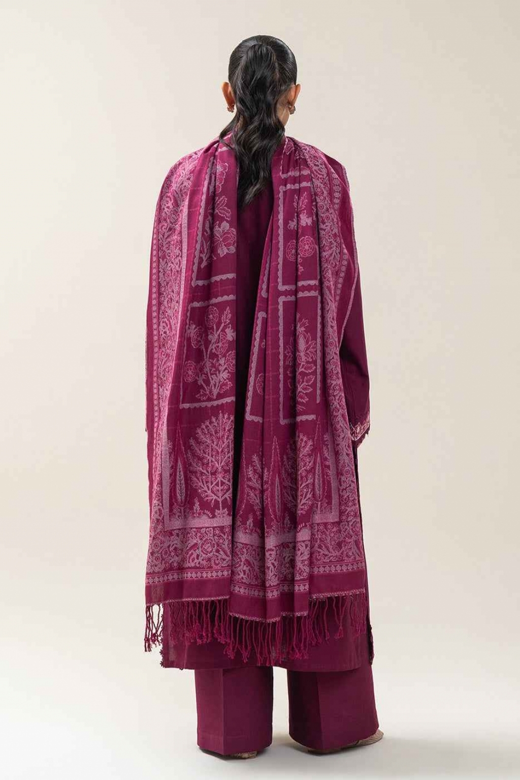 1.2 Mtrs Embroidered Light-Khaddar Front, 0.76 Mtrs Embroidered Sleeves Border, 0.5 Mtrs Light-Khaddar Sleeves, 1.2 Mtrs Light-Khaddar Back , 2.5 Mtrs Jacquarad Shawl, 1.8 Mtrs Dyed Pants