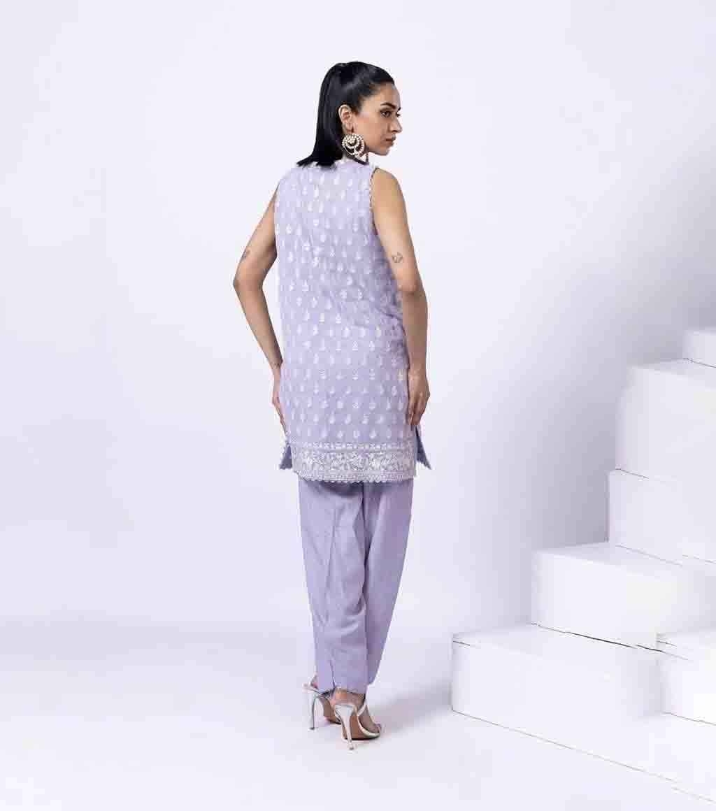 Fit: Smart Fabric Composition: 100% Polyester Material: Polyester Crinkle Chiffon Description: A short floral embroidered kurta featuring a sleeveless design and a diamond neckline