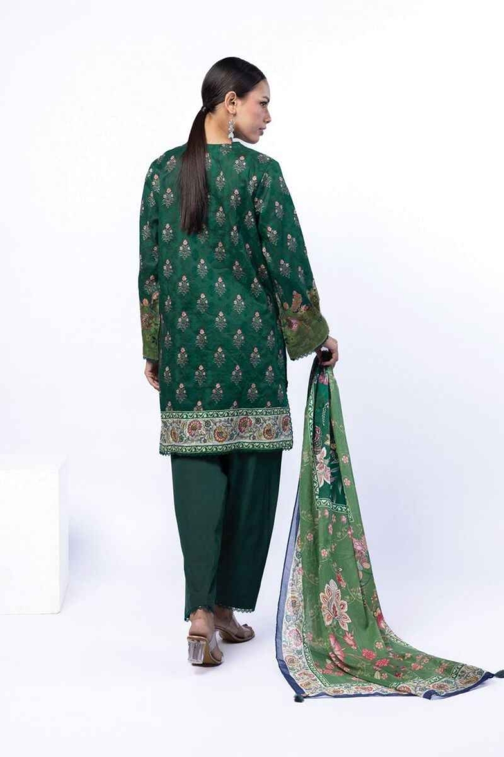 Style Collection: Forest Green Tailored 3 Piece Printed Broshia 3pc Suit by Khaadi