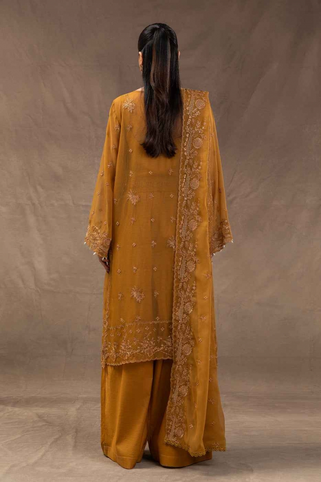 1.2 Mtrs Embroidered Chiffon Front, 0.76 Mtrs Embroidered Front Border, 0.76 Mtrs Embroidered Sleeves Border, 0.5 Mtrs Embroidered Chiffon Sleeves, 1.2 Mtrs Embroidered Chiffon Back, Embroidered Back Border 1 Pc , 2 Mtrs Dyed Inner, 2.5 Mtrs Embroidered Chiffon Dupatta, 2.5 Mtrs Raw Silk Pants