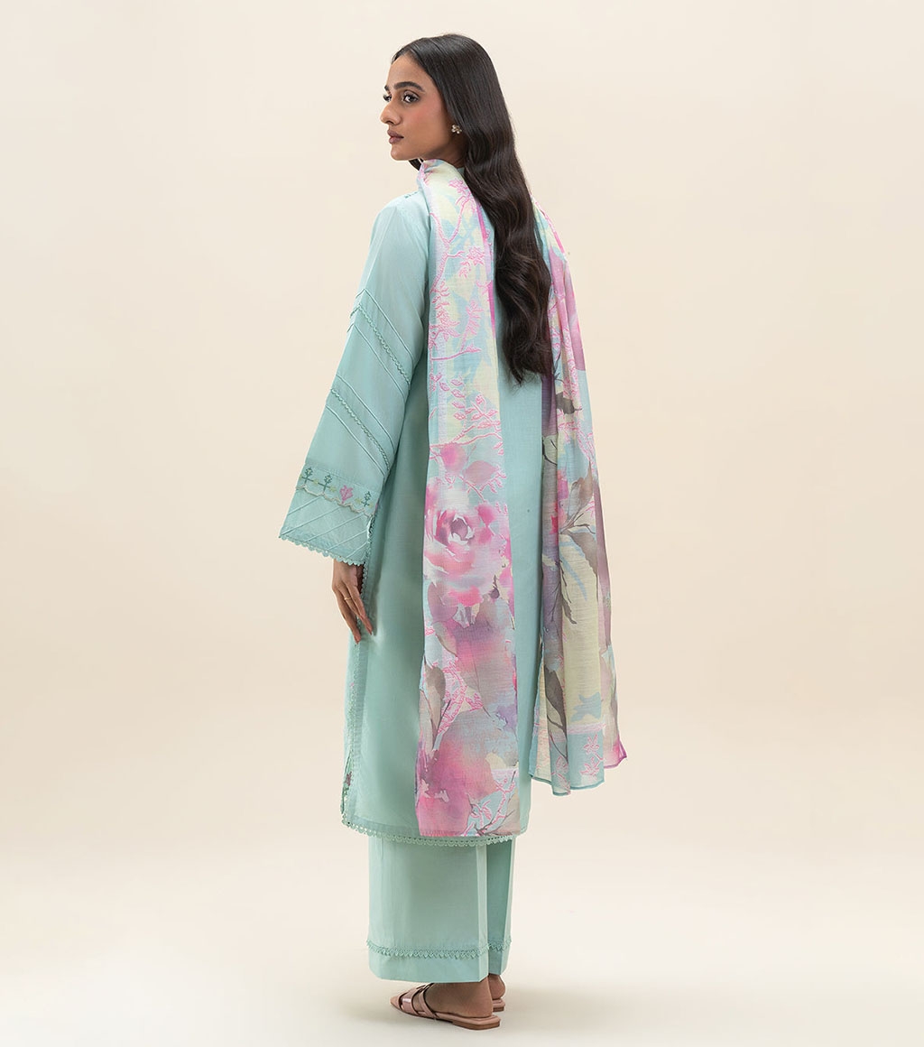 1.2 Mtrs Embroidered Lawn Front, 0.76 Mtrs Embroidered Sleeves Border, 0.5 Mtrs Lawn Sleeves, 1.2 Mtrs Lawn Back, 2.5 Mtrs Digital Printed Monarc Dupatta , 1.8 Mtrs Dyed Pants