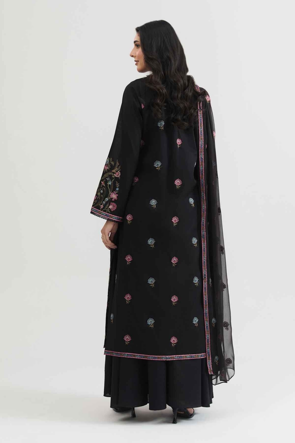 Eid collection 2026 sale Shirt Dyed & Embroidered Lawn Shirt Front 1.25 M Dyed & Embroidered Lawn Shirt Back 1.25 M Dyed & Embroidered Lawn Sleeves 0.66 M Fabric: Lawn Color: Black Dupatta Dyed & Embroidered Bamber Chiffon Dupatta 2.5 M Fabric: Bamber Chiffon Color: Black Trouser Dyed Cambric Trouser 2.5 M Fabric: Cambric Color: Black