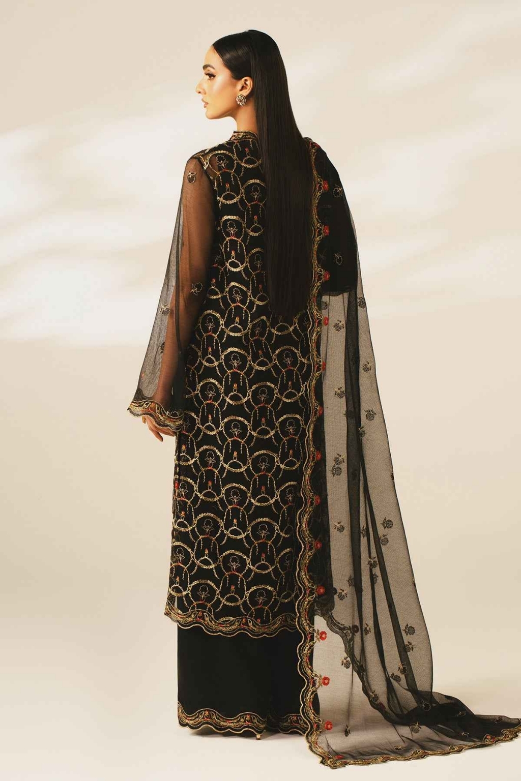 Eid collection 2026 sale 4-Piece Unstitched Shirt Dyed & Embroidered Cherry Net Front 1.25 M Dyed & Embroidered Cherry Net Back 1.25 M Dyed & Embroidered Cherry Net Sleeve 0.66 M Dyed & Embroidered Cherry Net Sleeve & Neck Lace 0.2 M Fabric: Cherry Net Color: Black Lining Dyed Cotton Lawn Lining Fabric: Cotton Lawn Color: Black Dupatta Dyed & Embroidered Cherry Net Dupatta 2.5 M Fabric: Cherry Net Color: Black Trousers Dyed & Embroidered Pk Raw Silk Trousers 2.5 M Dyed And Embroidered Pk Raw Silk Shalwar Lace 0.09 M Fabric: Pk Raw Silk Color: Black