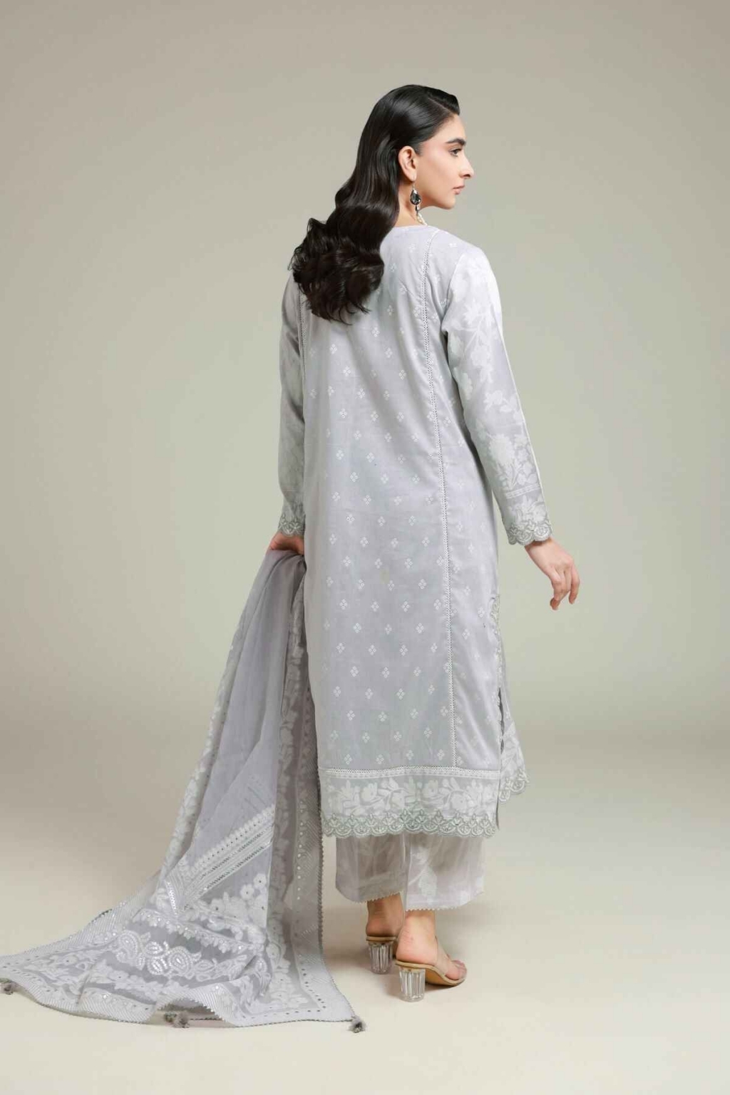 Fabrics 3 Piece Top Fabric: Paste Printed | Cambric | 3m Bottom Fabric: Paste Printed | Cambric | 2.5m Dupatta Fabric: Paste Printed | Polyester Net | 2.5m Material: Cambric Add Ons: Embroidered Neckline on organza Embroidered Organza Border | 5m