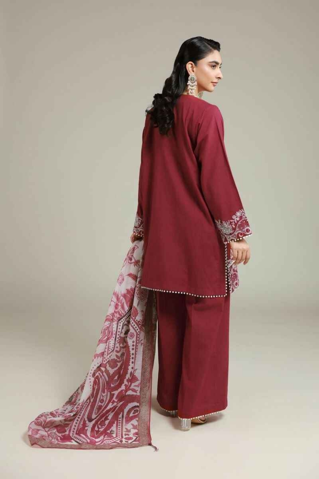 Fabrics 3 Piece Top Fabric: Dyed Embroidered | Cambric | 3.25m Bottom Fabric: Dyed | Cambric | 2.5m Dupatta Fabric: Digital Printed | Textured Organza | 2.5m Material: Cambric