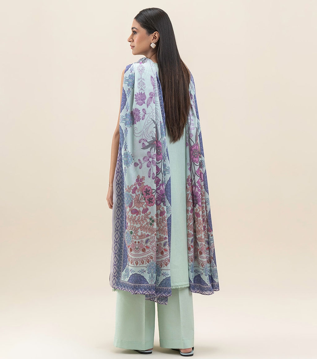 1.2 Mtrs Embroidered Lawn Front, 0.76 Mtrs Embroidered Sleeves Border , 0.5 Mtrs Lawn Sleeves, 1.2 Mtrs Lawn Back, 2.5 Mtrs Digital Printed Blended Silk Dupatta , 1.8 Mtrs Dyed Pants