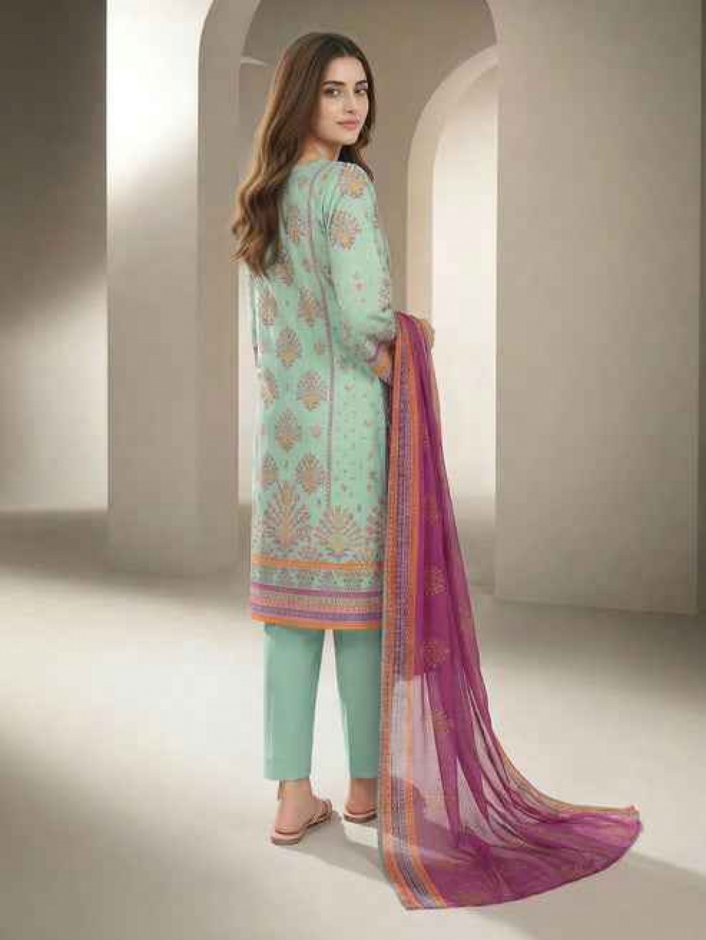 Shirt Printed-1.83m Fabric: Lawn Dupatta Printed- 2.5m Fabric: Chiffon Bottom Dyed- 1.8m Fabric: Cambric Color: Green