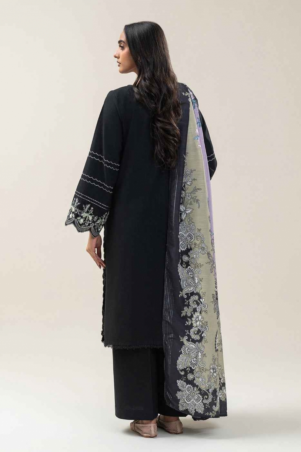 1.2 Mtrs Embroidered Light-Khaddar Front, 0.76 Mtrs Embroidered Front Border, 0.5 Mtrs Embroidered Light-Khaddar Sleeves, 1.2 Mtrs Light-Khaddar Back, 2.5 Mtrs Printed Zari Monarc Dupatta, 1.8 Mtrs Dyed Pants