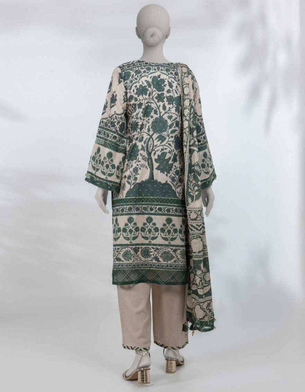 Basic 3 Piece Printed Jacquard Shirt: 2.5 Meters Printed Jacquard Dupatta: 2.5 Meters Dyed Lawn Trouser: 2.5 Meters