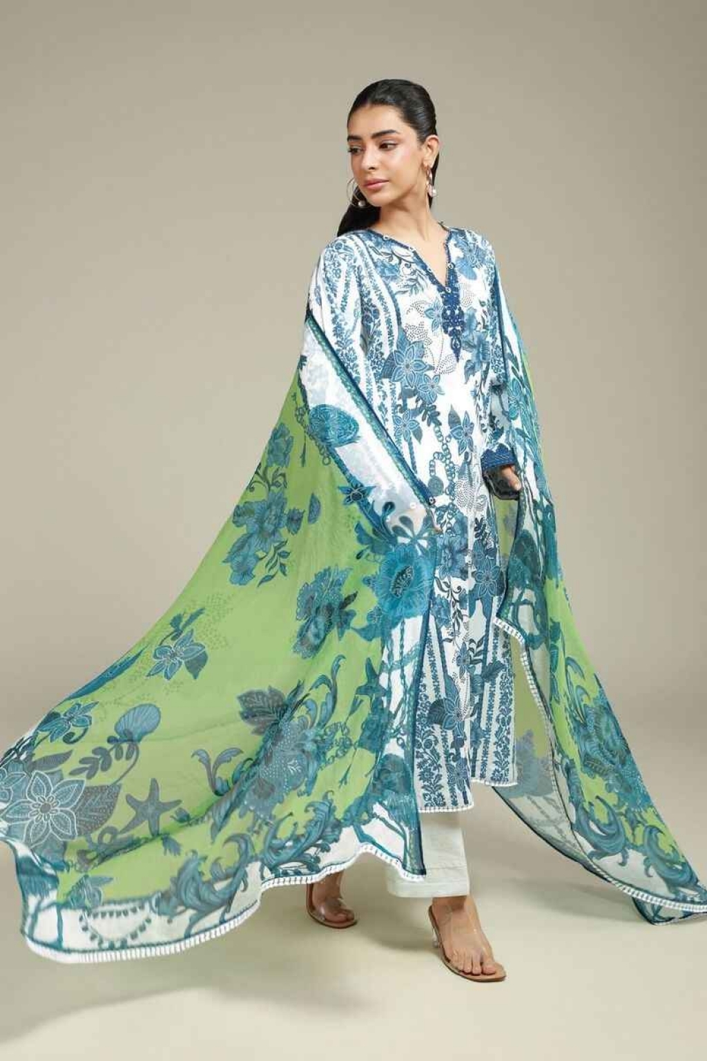 Fabrics 3 Piece Top Fabric: Digital Printed | Satin | 3m Bottom Fabric: Dyed | Satin | 2.5m Dupatta Fabric: Digital Printed | Chiffon | 2.5m Material: Satin Add Ons: Embroidered Neckline on organza Embroidered Organza Bunches | 2pc
