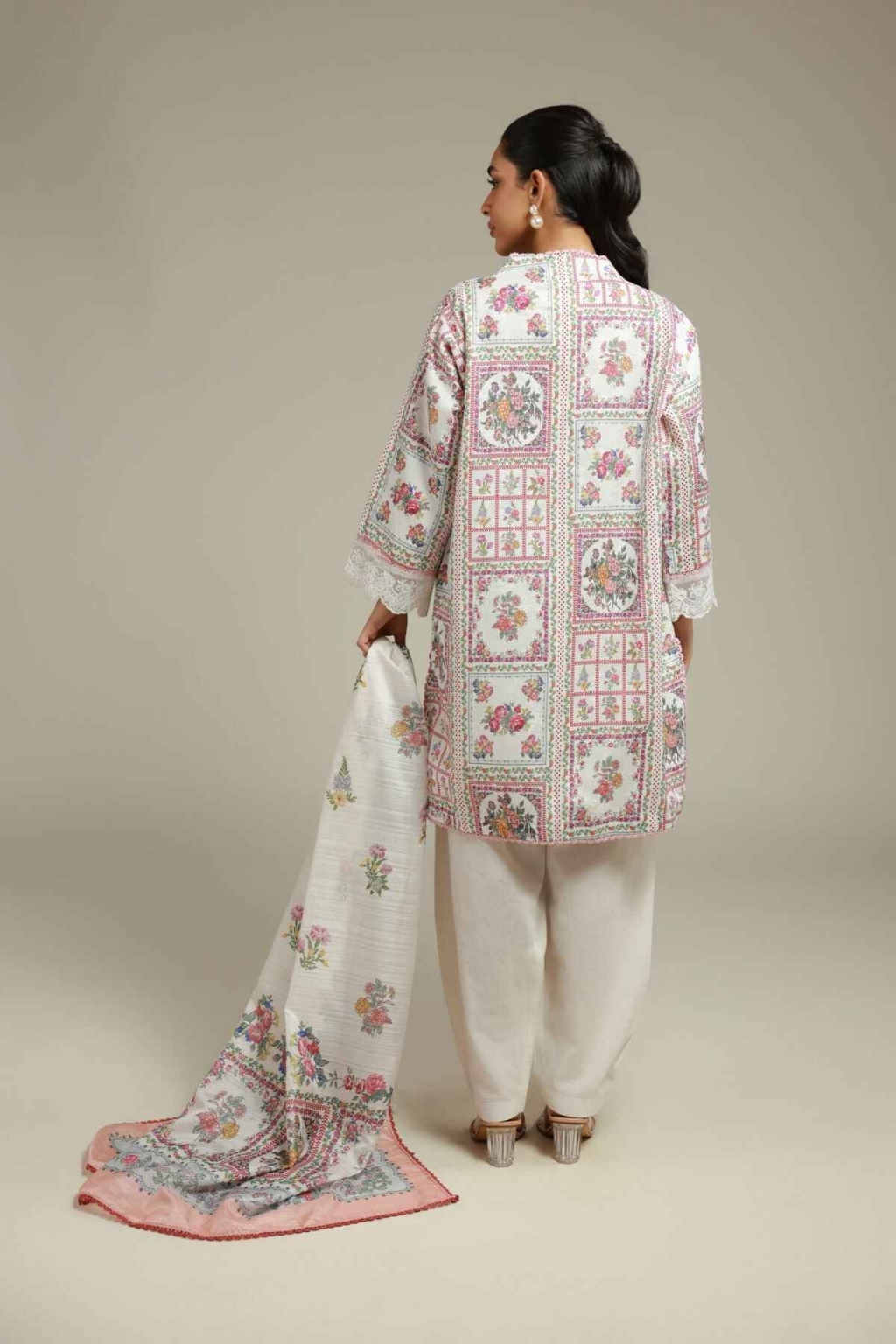 Fabrics 3 Piece Top Fabric: Digital Printed | Jacquard | 3m Bottom Fabric: Dyed | Cotton Viscose | 2.5m Dupatta Fabric: Digital Printed | Polyester Silk | 2.5m Material: Jacquard Add Ons: Embroidered Organza Border | 1m -