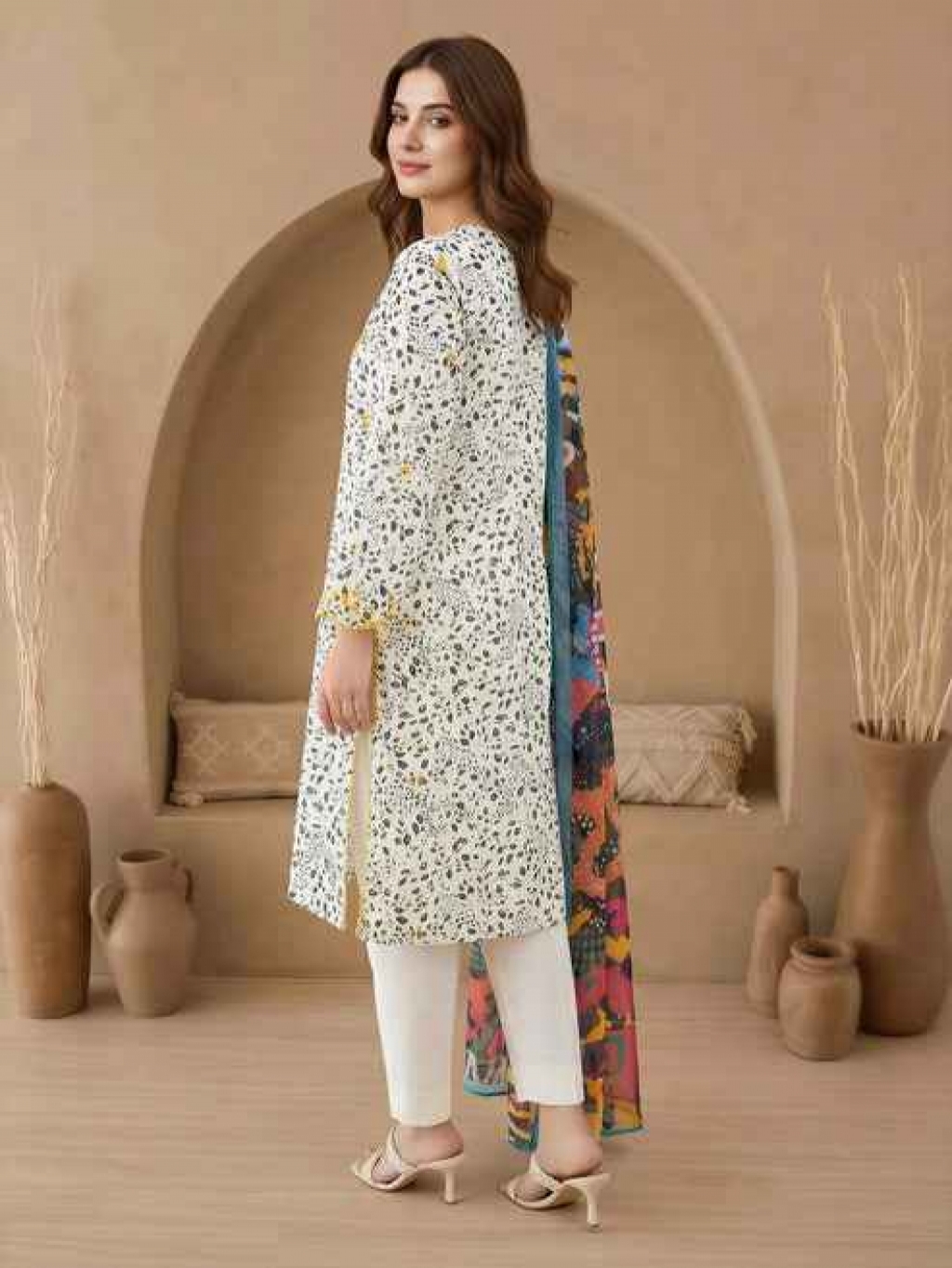 Shirt Embroidered- 2.45m Fabric: Lawn Dupatta Printed- 2.74m Fabric: Chiffon Bottom Printed- 1.8m Fabric: Cambric Color: Off White