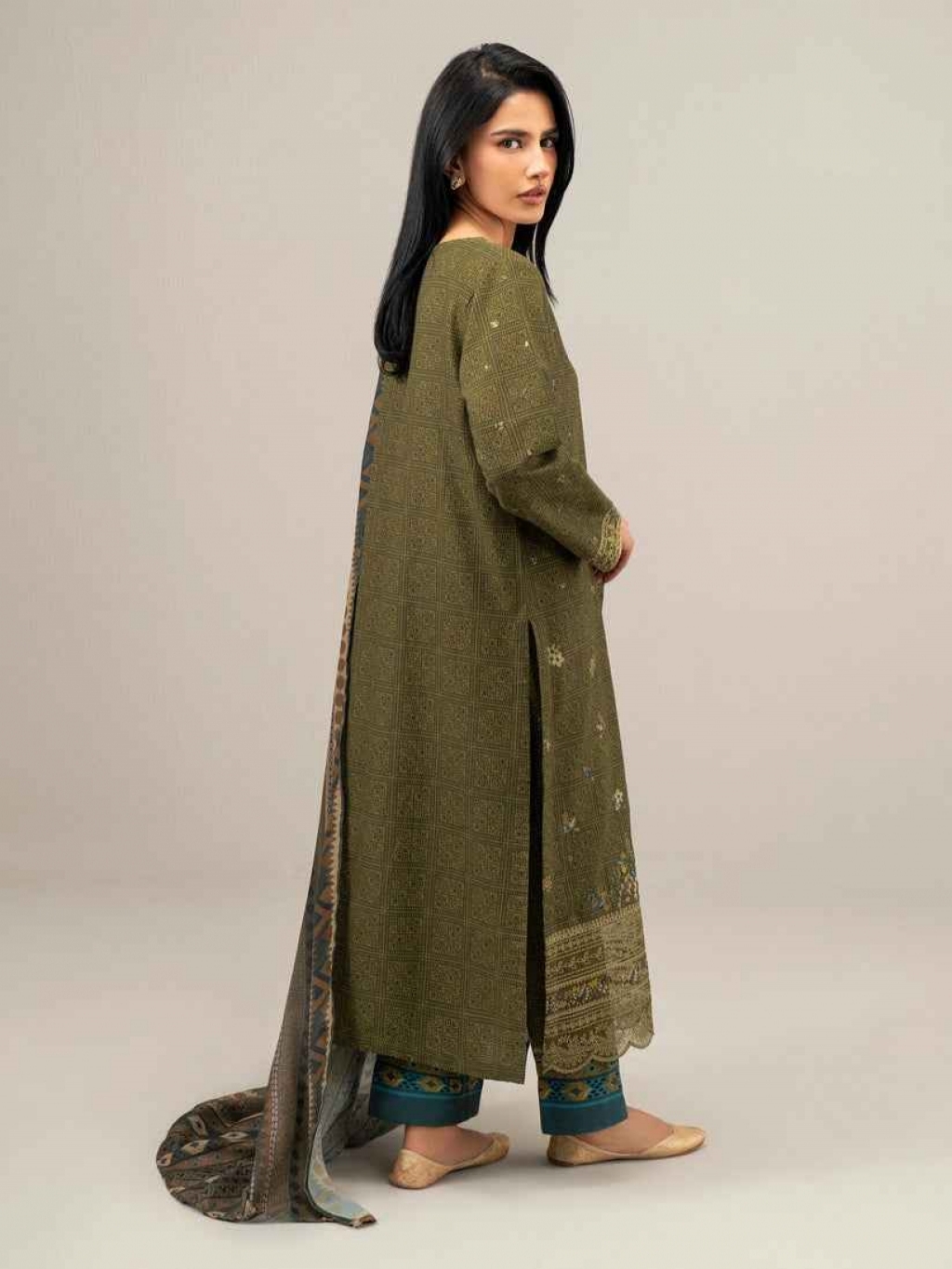 Shirt Embroidered- 2.75m Fabric: Slub Khaddar - Medium Shawl Printed- 2.5m Fabric: Poly Wool Bottom Dyed- 1.8m Fabric: Khaddar Color: Olive