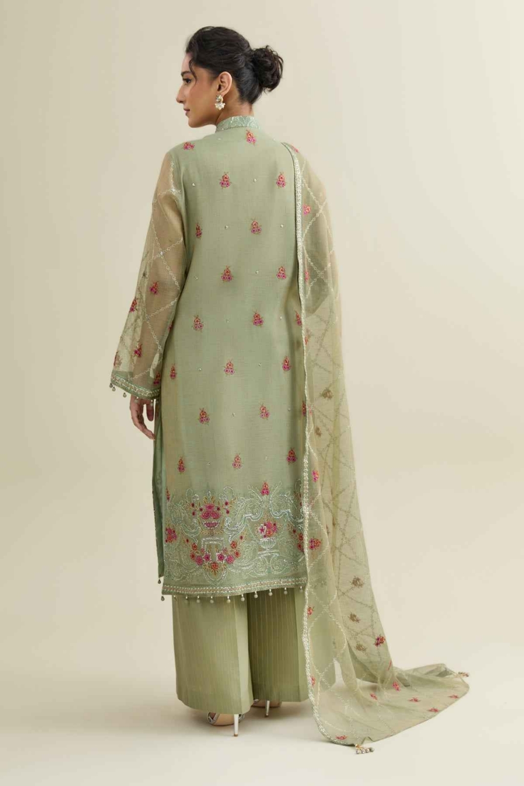 Eid collection 2026 sale 4-Piece Unstitched Shirt Dyed & Embroidered Shimmer Silk Net Shirt Front 1.25 M Dyed & Embroidered Shimmer Silk Net Shirt Back 1.25 M Dyed & Embroidered Shimmer Silk Net Sleeves 0.66 M Fabric: Shimmer Silk Color: Sage Green Lining Dyed Cotton Silk Lining 2.5 M Fabric: Cotton Silk Color: Sage Green Dupatta Dyed & Embroidered Shimmer Silk Net Dupatta 2.5 M Fabric: Shimmer Silk Color: Sage Green Trouser Dyed Wider Width Golden Jacquard Trouser 2.5 M Fabric: Golden Jacquard Color: Sage Green