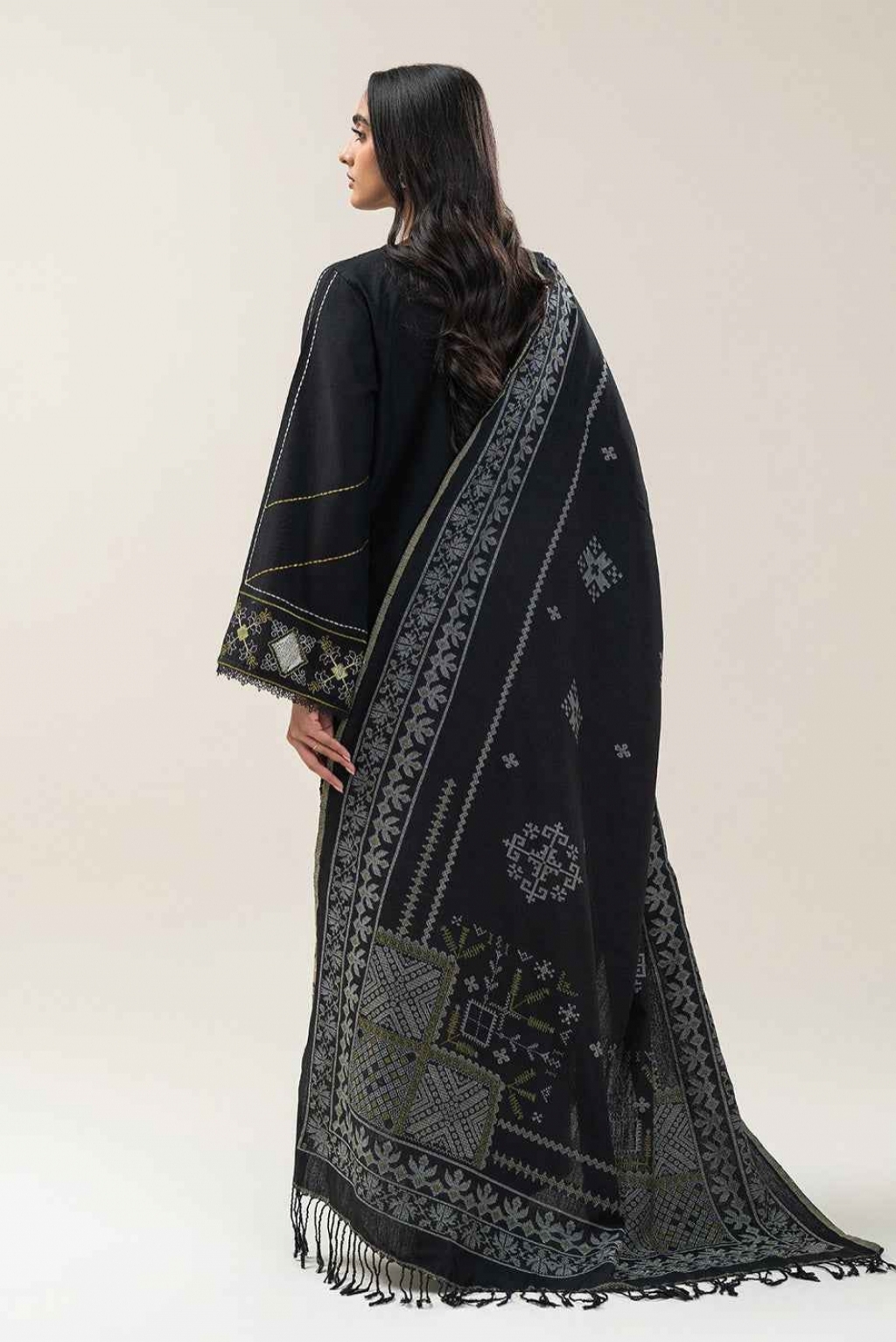 1.2 Mtrs Embroidered Light-Khaddar Front, 0.76 Mtrs Embroidered Front Border, 0.5 Mtrs Embroidered Light-Khaddar Sleeves, 1.2 Mtrs Light-Khaddar Back, 2.5 Mtrs Jacquarad Shawl, 1.8 Mtrs Dyed Pants