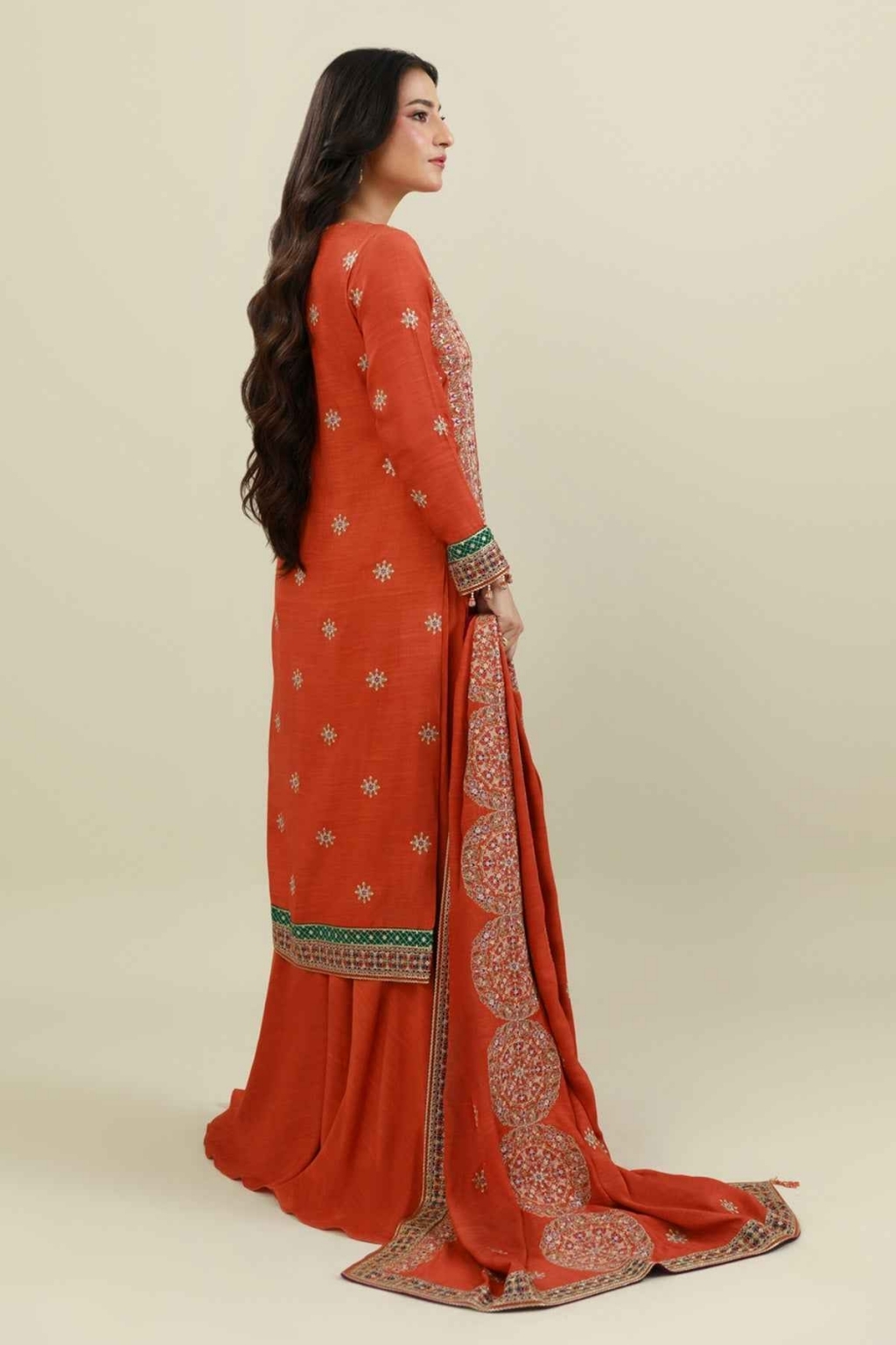 Eid collection 2026 sale 3-Piece Unstitched Shirt Dyed & Embroidered Wider Width Raw Silk Shirt Front 1.25 M Dyed & Embroidered Wider Width Raw Silk Shirt Back 1.25 M Dyed & Embroidered Raw Silk Lace 1 (Green) For Shirt 2.5 M Dyed & Embroidered Raw Silk Lace 2 (Magenta) For Shirt 2.5 M Fabric: Raw Silk Color: Orange Dupatta Dyed & Embroidered Wider Width Raw Silk Shawl 2.5 M Dyed & Embroidered Raw Silk Lace (Magenta) For Shawl 8 M Fabric: Raw Silk Color: Orange Trouser Dyed Wider Width Raw Silk Trouser 2.5 M Fabric: Raw Silk Color: Orange