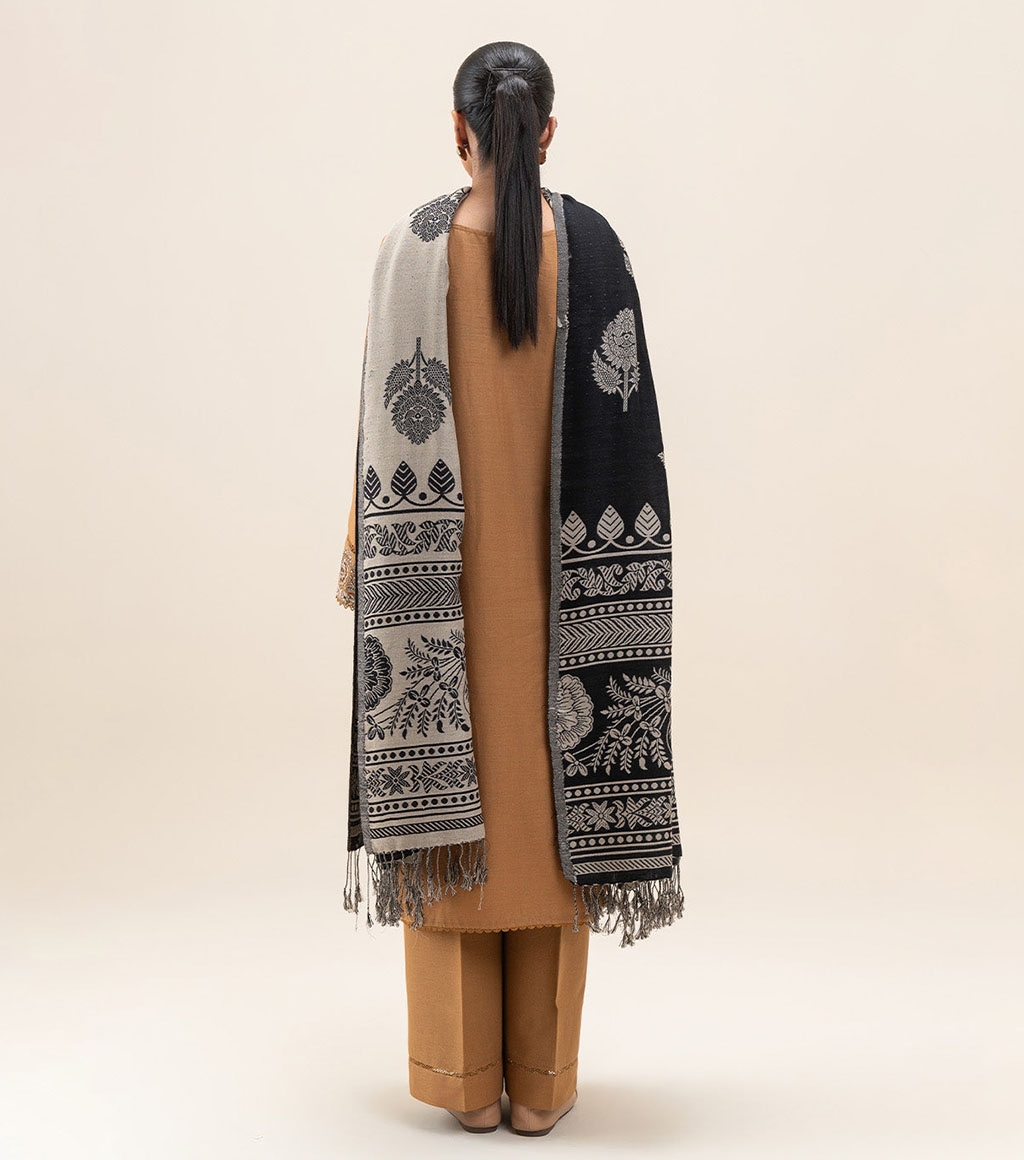 1.2 Mtrs Embroidered Light-Khaddar Front, 0.76 Mtrs Embroidered Sleeves Border, 0.5 Mtrs Light-Khaddar Sleeves, 1.2 Mtrs Light-Khaddar Back, 2.5 Mtrs Jacquarad Shawl, 1.8 Mtrs Dyed Pants