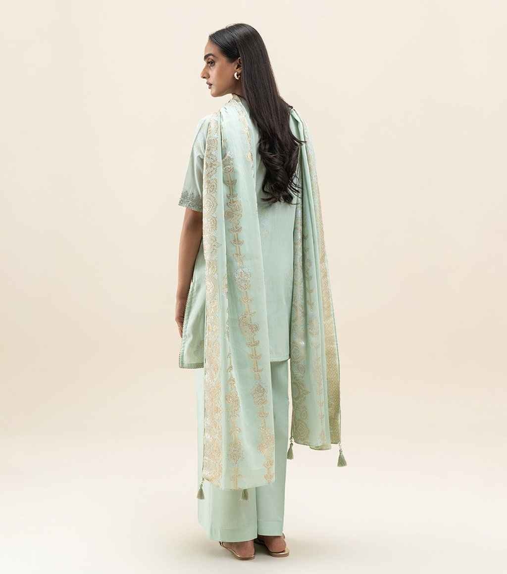 2 Mtrs Lurex Jacquarad Shirt , Embroidered Neckline On Tissue 1 Pc , Embroidered Front Border On Tissue 1 Pc, Embroidered Sleeves Border On Tissue 1 Pc, 2.5 Mtrs Lurex Jacquarad Dupatta , 2.5 Mtrs Dyed Pants