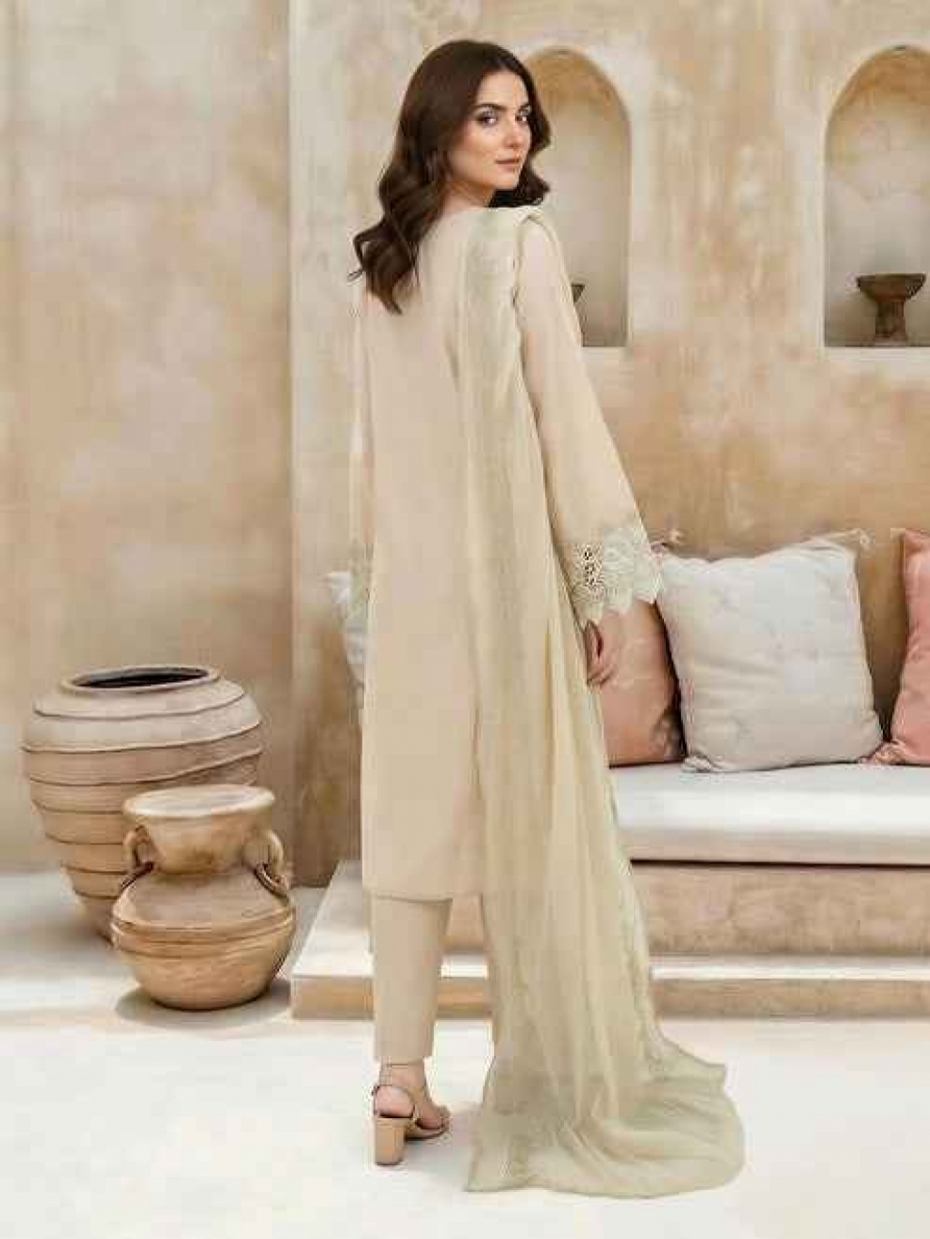 Shirt Embroidered- 3.1m Fabric: Cambric Dupatta Embroidered- 2.75m Fabric: Khaadi Net Bottom Dyed- 1.8m Fabric: Cambric Color: Beige