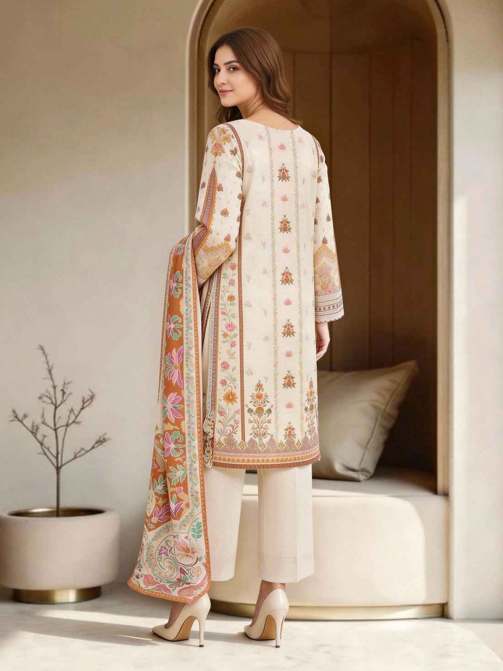Shirt Embroidered- 2.33m Fabric: Lawn Dupatta Printed- 2.5m Fabric: Voile Bottom Dyed- 1.8m Fabric: Cambric Color: Off White