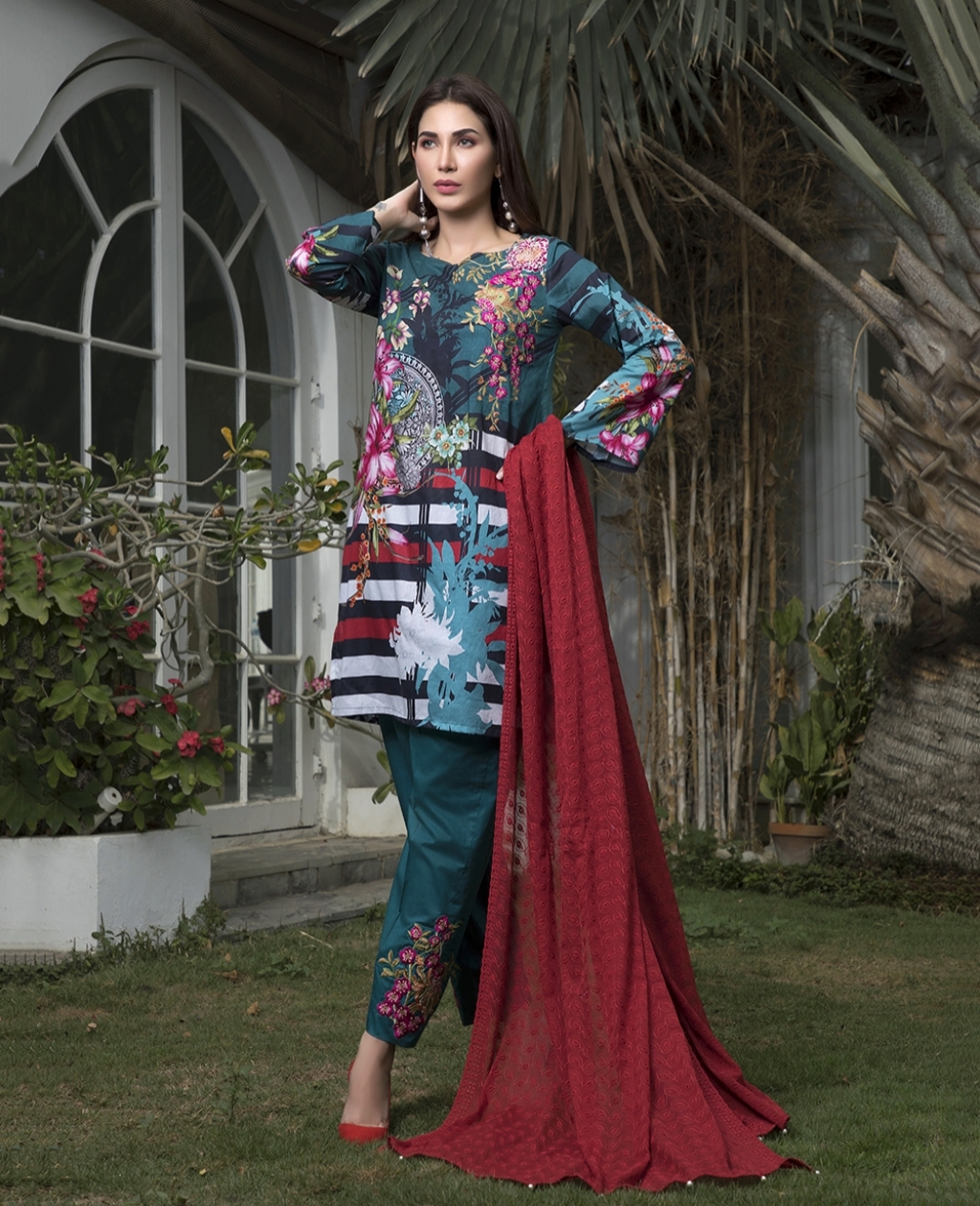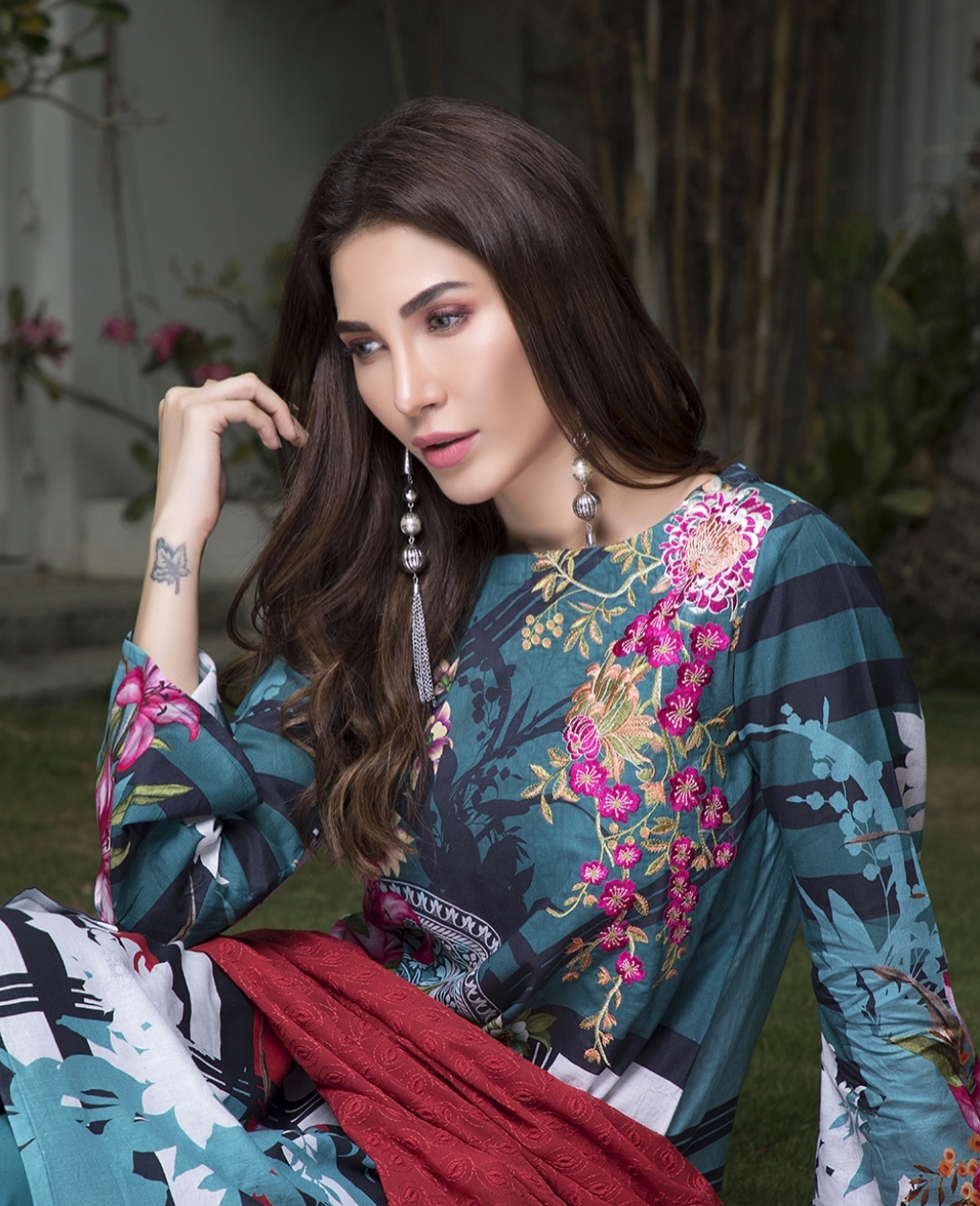 Digital embroidered lawn shirt 3M Schiffli embroidered dupatta 2.5M Cotton cambric trouser 2.5M ACCESSORIES: Embroidered tissue patches