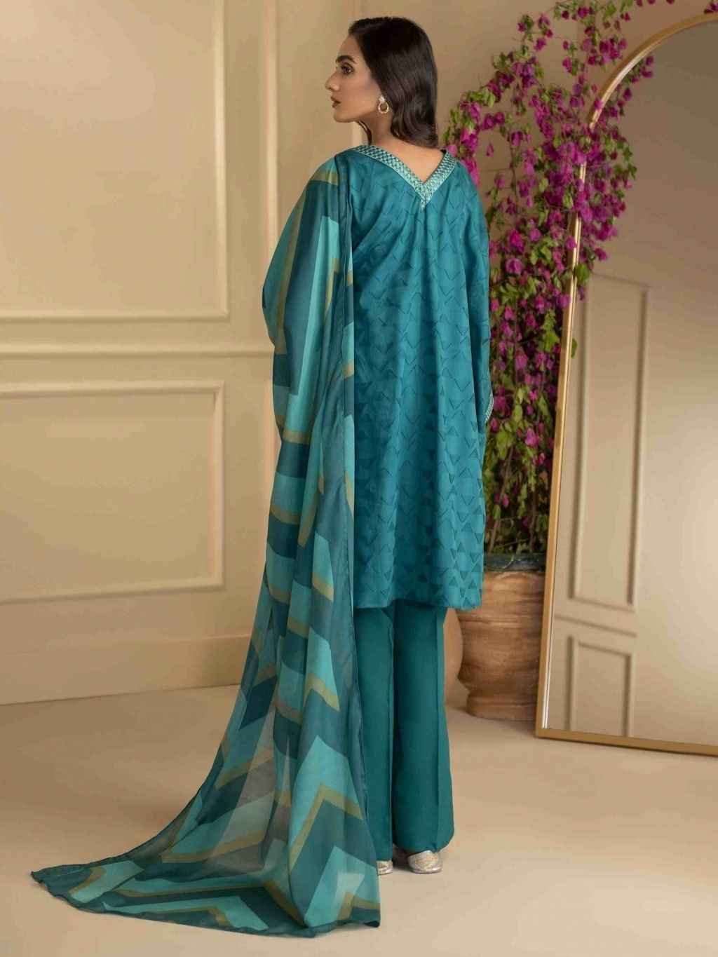 Teal Blue Unstitched 3Pc Printed Suit on Limelight Sale // Unstitched 3 Piece Embroidered Jacquard Suit (Shirt+Dupatta+Trouser) Geometric patterned neckline patti Printed front, back and sleeves with jacquard pattern Zari detailed and floral embroidered patterns on the front of the shirt Geometrical pattern embroidered cuff patti Three tone stripe patterned dupatta Dyed trousers Color: Teal Blue Fabric (Shirt): Jacquard Fabric (Dupatta): Voil Fabric (Trousers): Cambric Weight: 1054 g Code: U1616SU-3Pc-TBL
