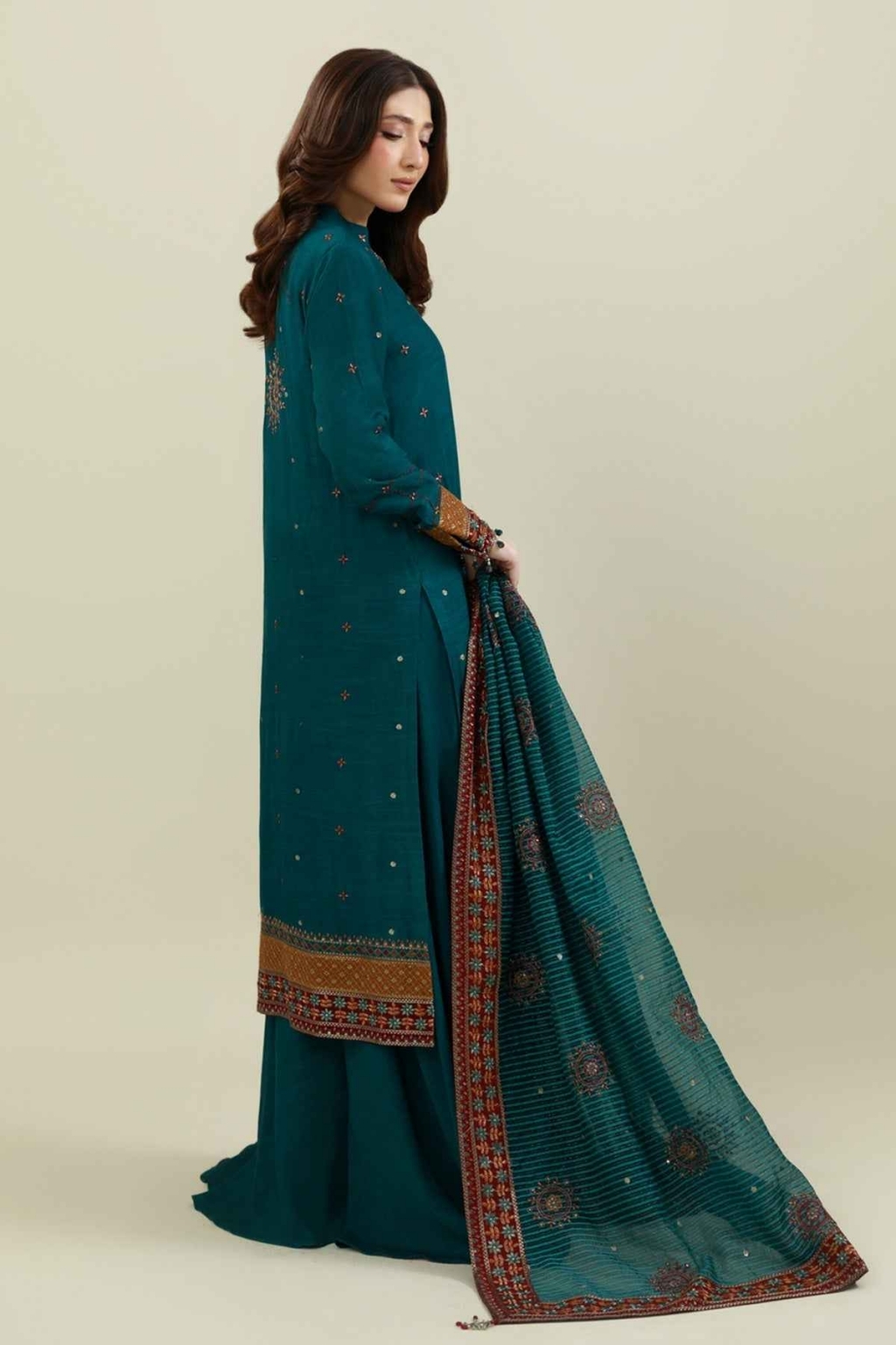 Eid collection 2026 sale 3-Piece Unstitched Shirt Dyed & Embroidered Wider Width Raw Silk Shirt Front 1 M Dyed & Embroidered Wider Width Raw Silk Shirt Back 1 M Dyed & Embroidered Wider Width Raw Silk Sleeves 0.66 M Dyed & Embroidered Raw Silk Lace (Maroon) For Shirt 2.5 M Dyed & Embroidered Raw Silk Lace (Mustard) For Shirt 2.5 M Fabric: Raw Silk Color: Teal Dupatta Dyed & Embroidered Organza Stripes Dupatta 2.5 M Dyed & Embroidered Raw Silk Lace (Maroon) For Dupatta 8 M Fabric: Organza Color: Teal Trouser Dyed Wider Width Raw Silk Trouser 2.5 M Fabric: Raw Silk Color: Teal