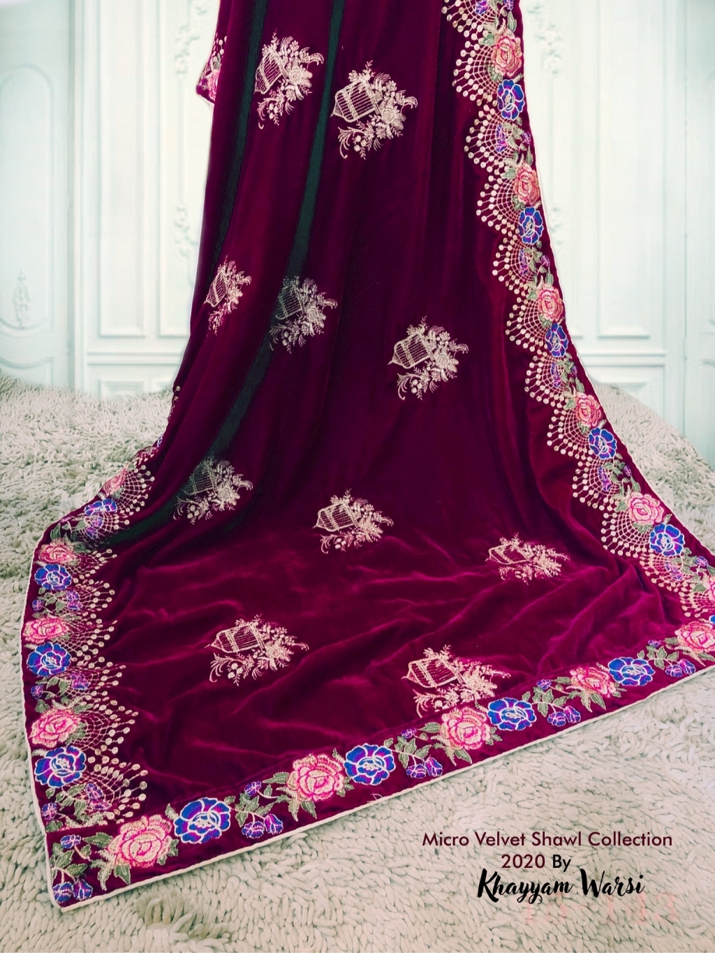Micro Velvet Shawl Original Embroidered By Khayyam Warsi. Color Magenta.