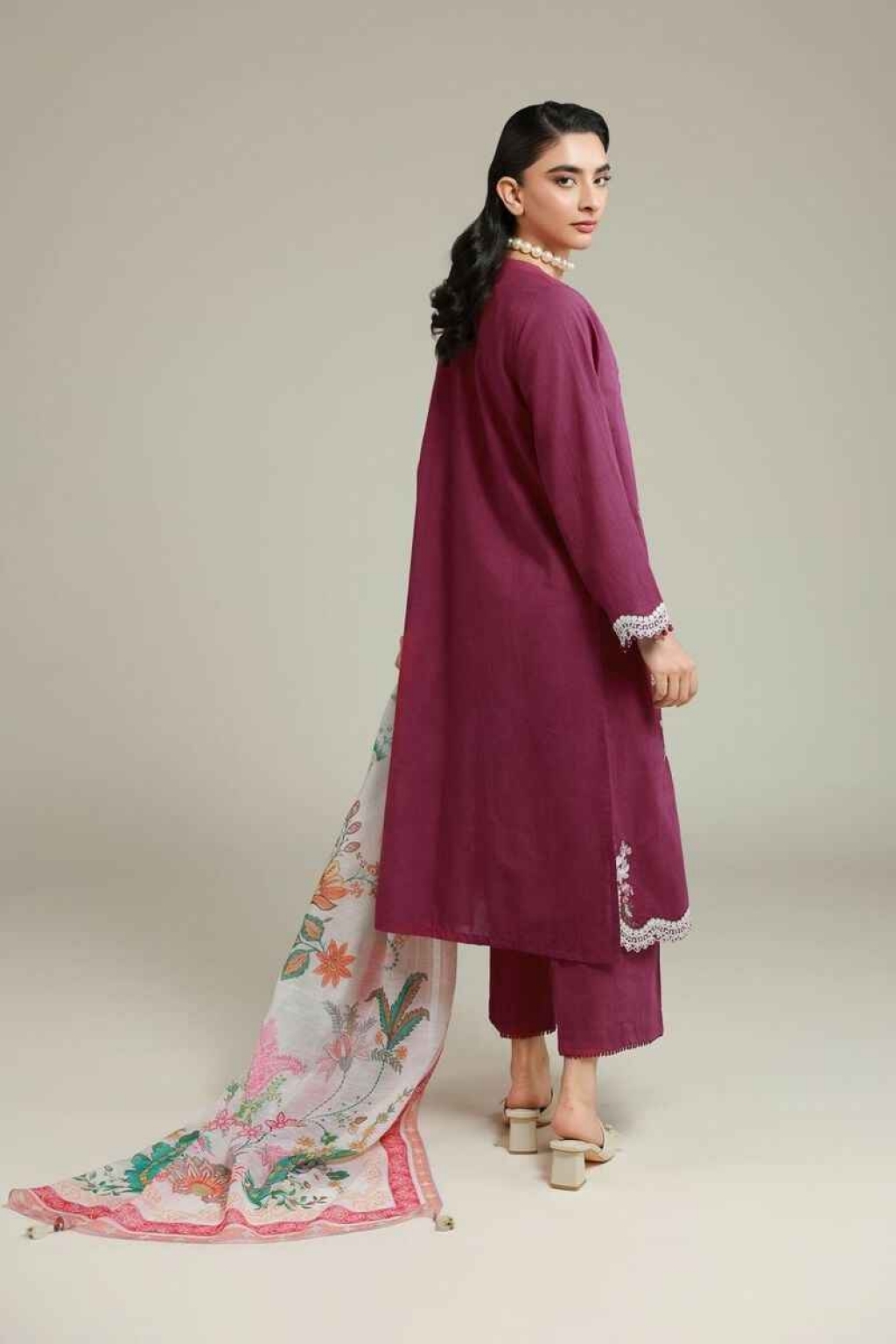 Fabrics 3 Piece Top Fabric: Dyed Embroidered | Cambric | 3.25m Bottom Fabric: Dyed | Cambric | 2.5m Dupatta Fabric: Digital Printed | Textured Organza | 2.5m Material: Cambric